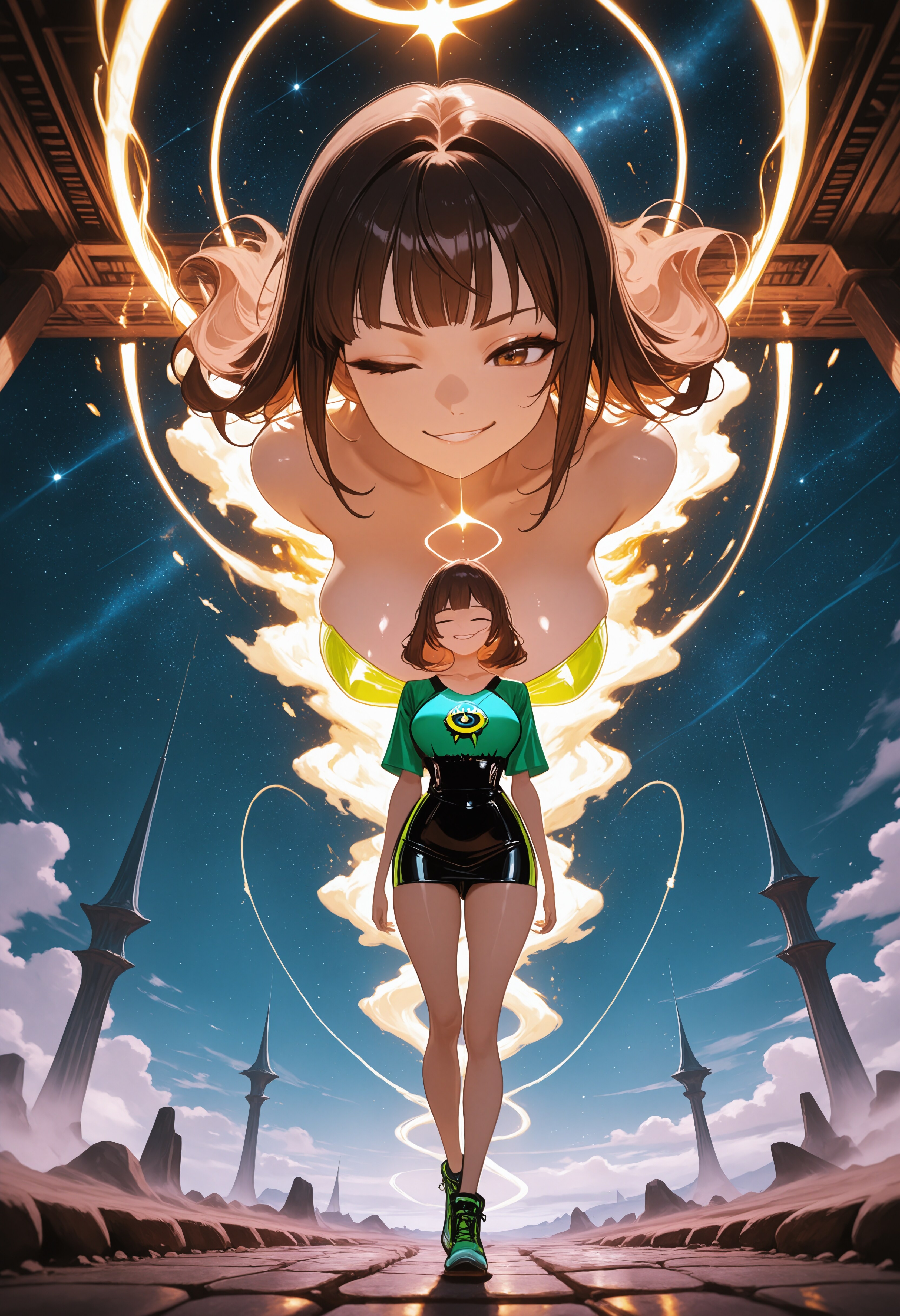 夜空にもう一人の自分が渦を描き、緑のラインが鼓動を刻む。歩幅ひとつで世界が更新される。