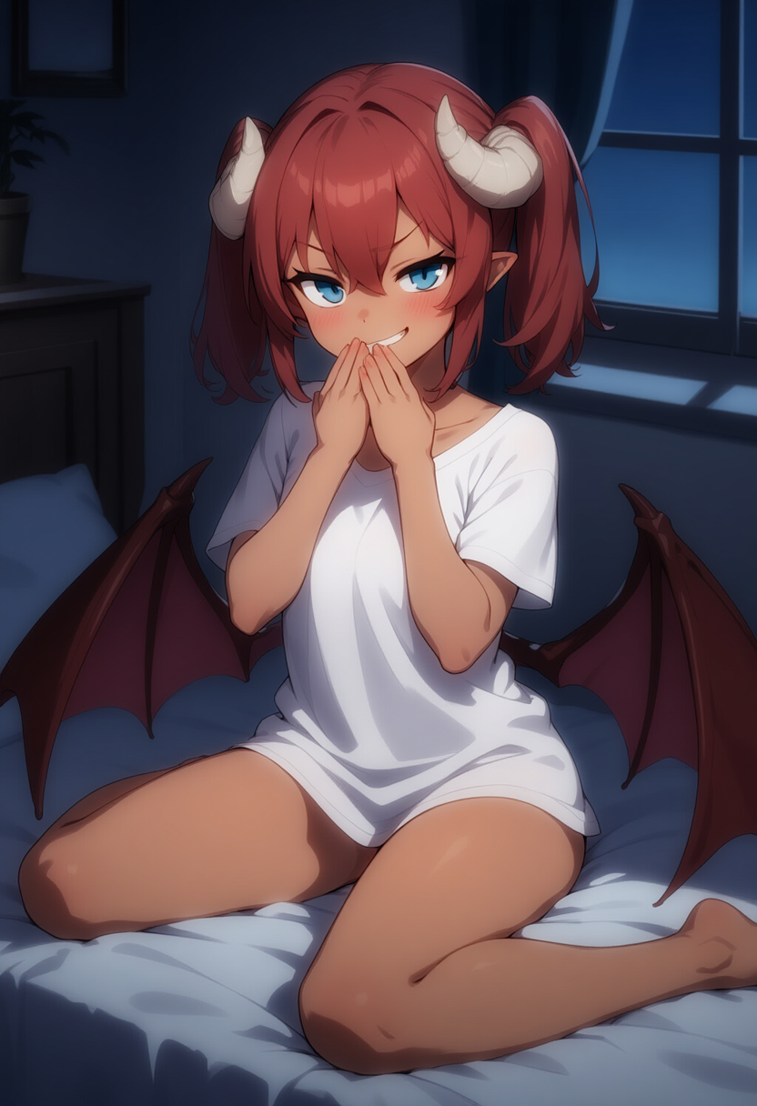 girl, succubus, dark skin, smirk, hands on mouth, sitting on bed, white shirt, bottomless, succubus horn, succubus wing, red brown hair, twin tails, blue eyes,