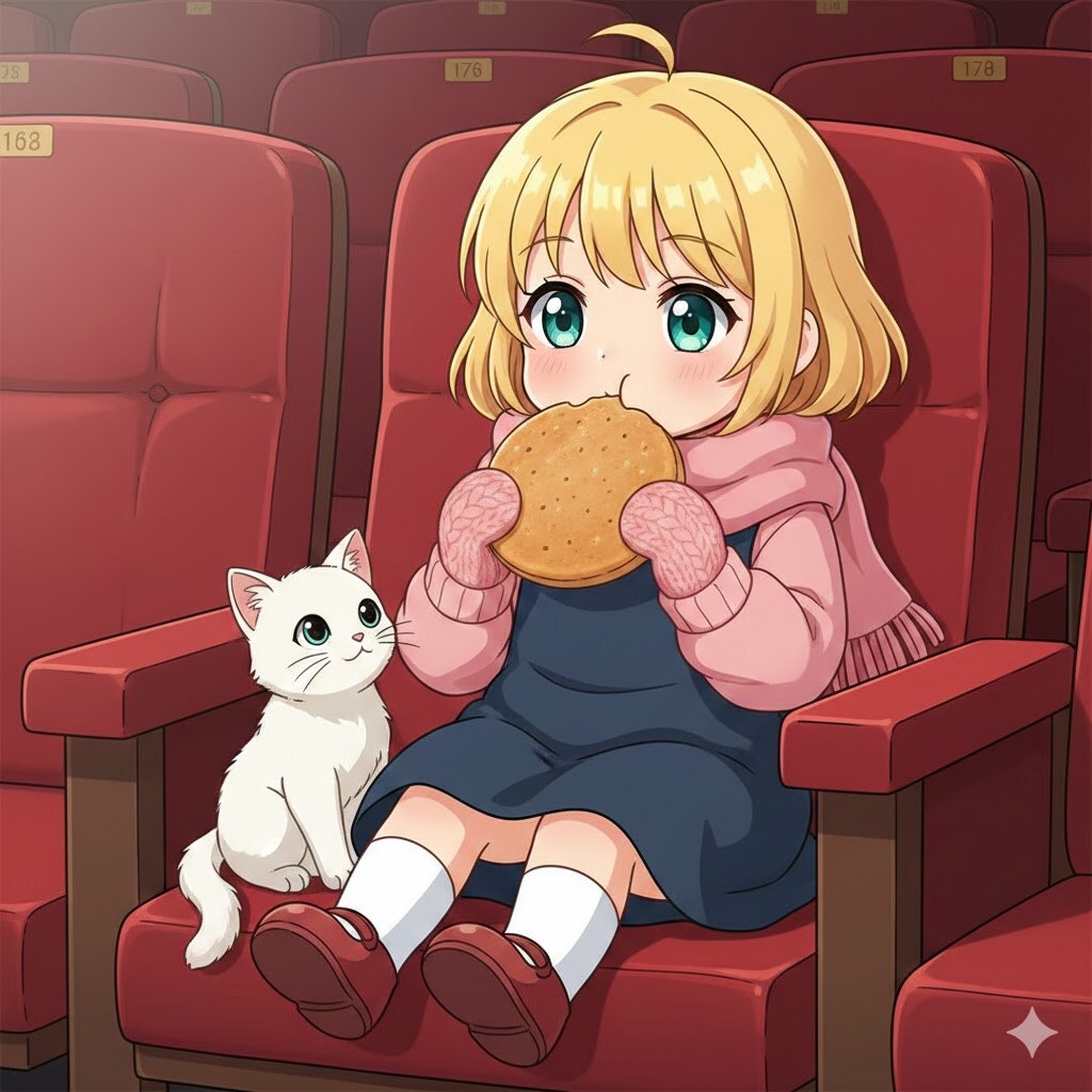 映画館で大きな煎餅を食べている、ちちぷいちゃん