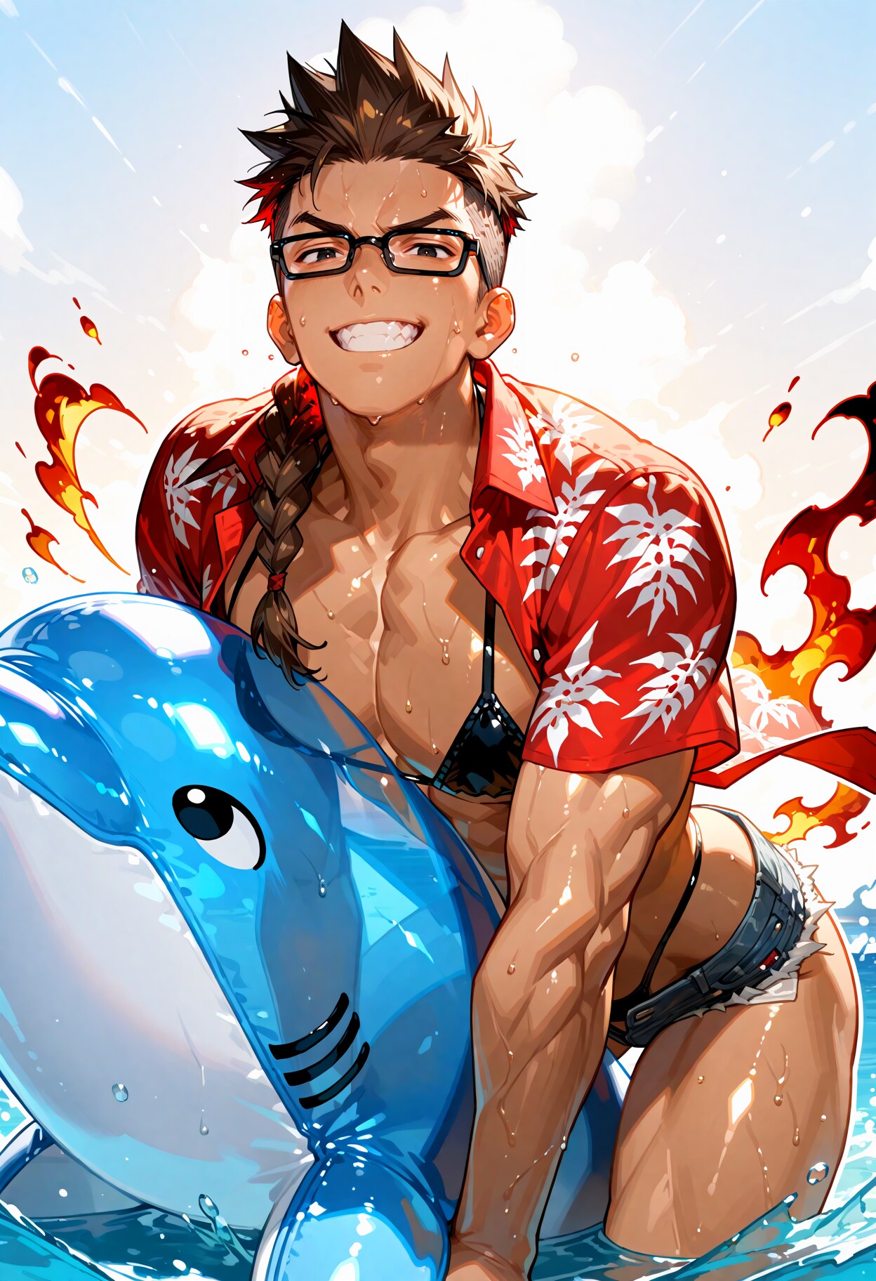 1man, muscular, pectorals, tan skin, brown hair, black eyes, spiked short hair, undercut, long braid, hair over shoulder,