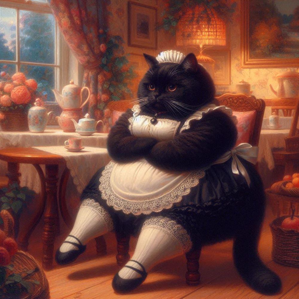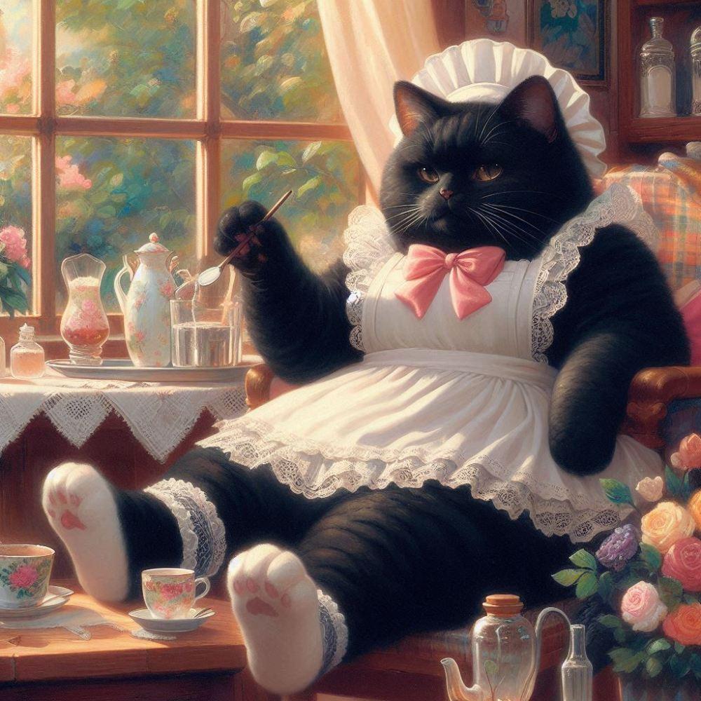 油絵ファンタジー、メイド黒猫、ニーハイソックス、猫メイドカフェ