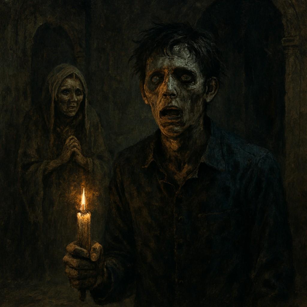 若者に蝋燭の火を絶やさずに歩き続けるよう告げた。逃げ出すことも出来ず、蠟燭の火を持ち、廃墟の中を歩き始めたが、風で直ぐに消えた。