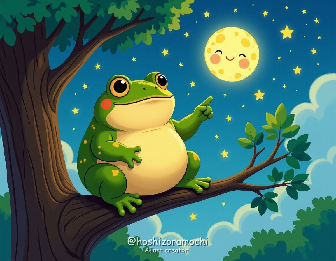 絵本の1ページ、木のてっぺんで星を数えるガマ / A page from a picture book, a frog counting stars at the top of a tree
