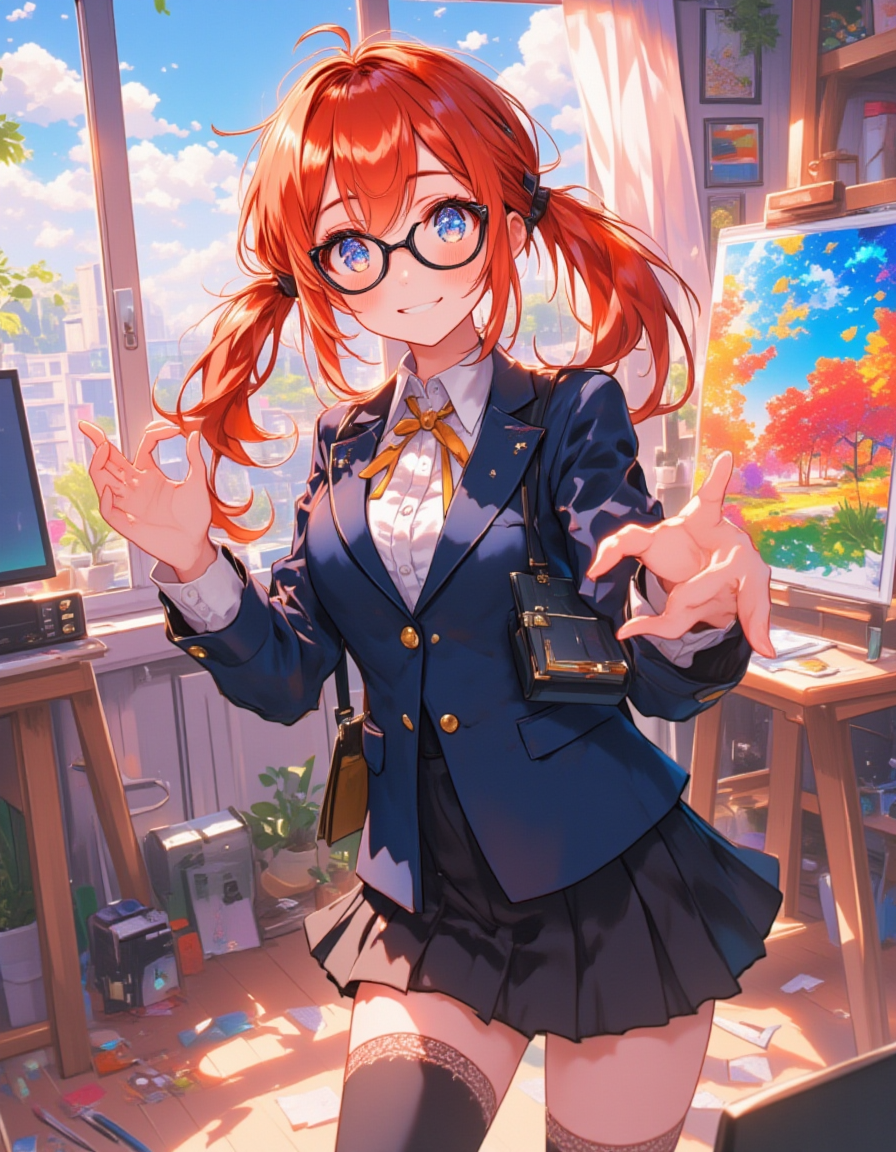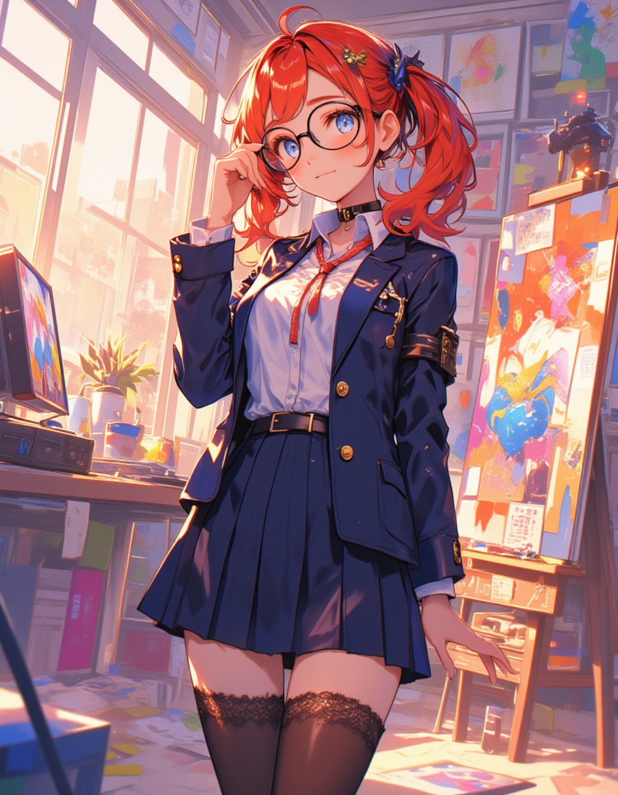 Character: A petite anime-style girl with long red hair styled in low symmetrical twintails with soft waves from ear to hair tip,detailed dark blue tareme eyes with double eyelids,long eyelashes,and augmented eye highlights for a captivating,expressive gaze. She wears black-rimmed round glasses enhancing her intellectual yet charming appearance,has delicate freckles on her face,a constricted waist,small breasts,and a confident expression with a subtle,playful smirk. Inspired by the art styles of Sakura Oriko (0.4 influence),Morikura En (0.3 influence),and Momopoco (0.3 influence).,