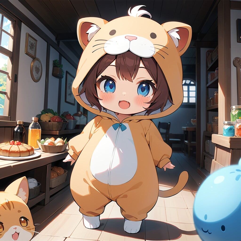ライオンの着ぐるみのキティは仲間のミケに話しかけます
