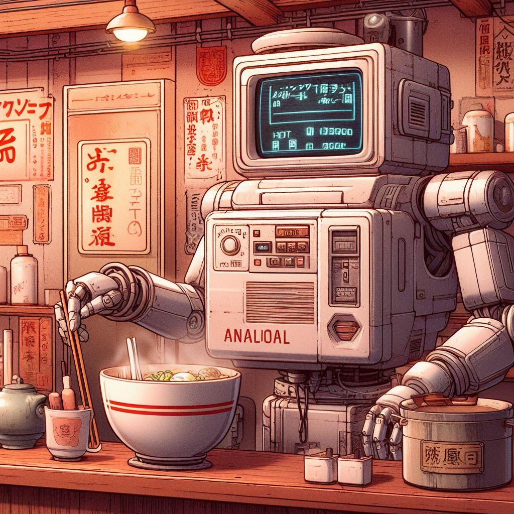 およそ100年以上の設計体系のロボットがインプットされた言語は『ナニニシマスカ?』、『ドウゾ』、『アリガトウゴザイマシタ』だけコレ以外はラーメン作成しか出来ずファンを唸らせる、ラーメンもどこにそんな機能があるのか不思議だが何故か毎日切らさずに提供出来るトコも七不思議らしいとこだ