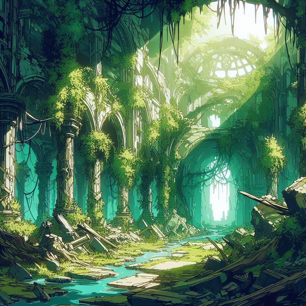 漫画版「風の谷のナウシカ」における不思議な場所(絶滅した動物等が生息)をイメージして生成しました。