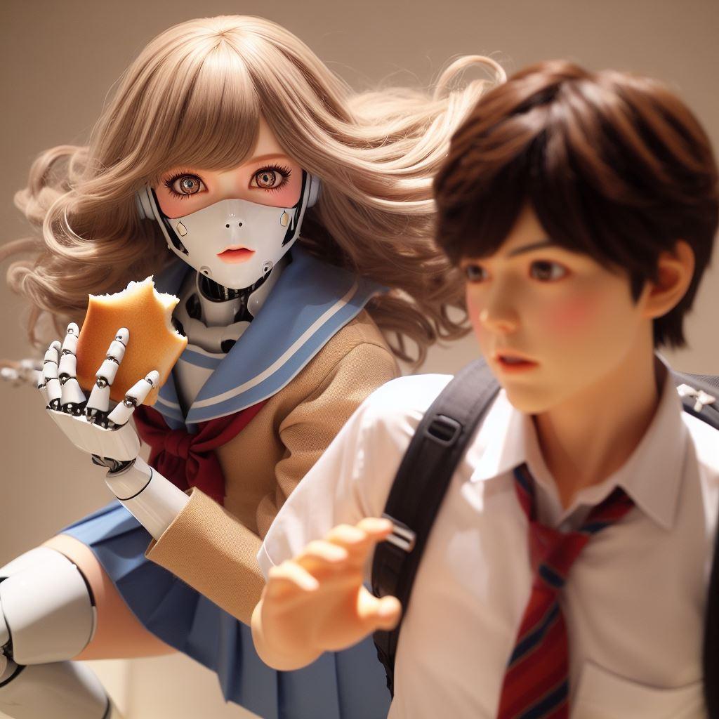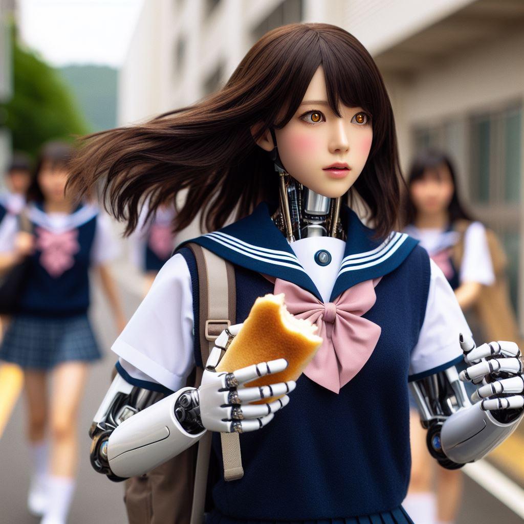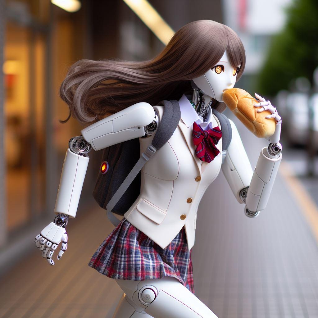 1-3枚目:遅刻しないようにパンをくわえて学校へ急ぐロボット娘