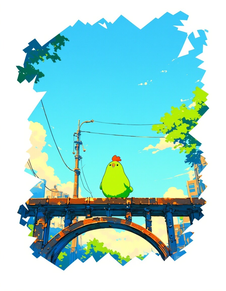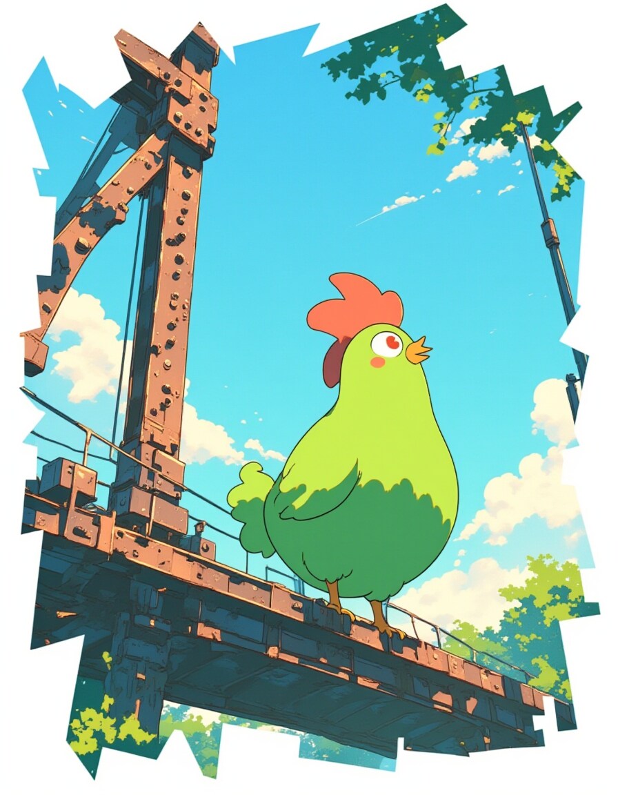 橋の上の緑のにわとり