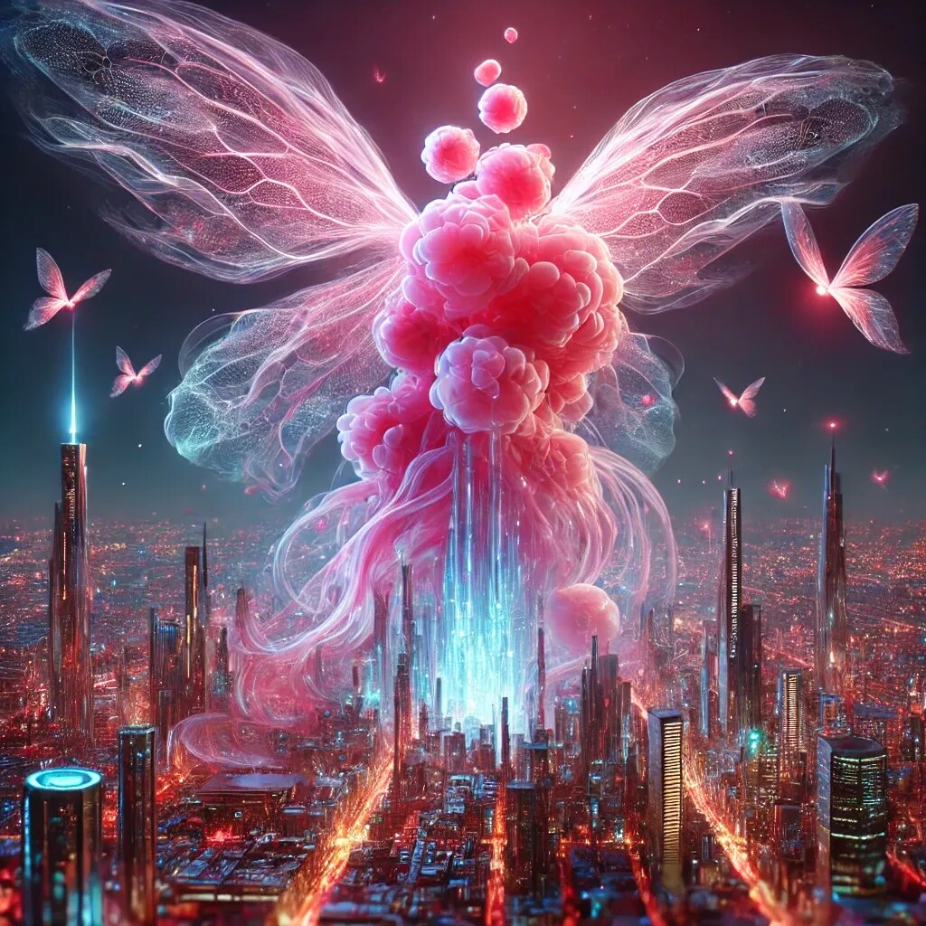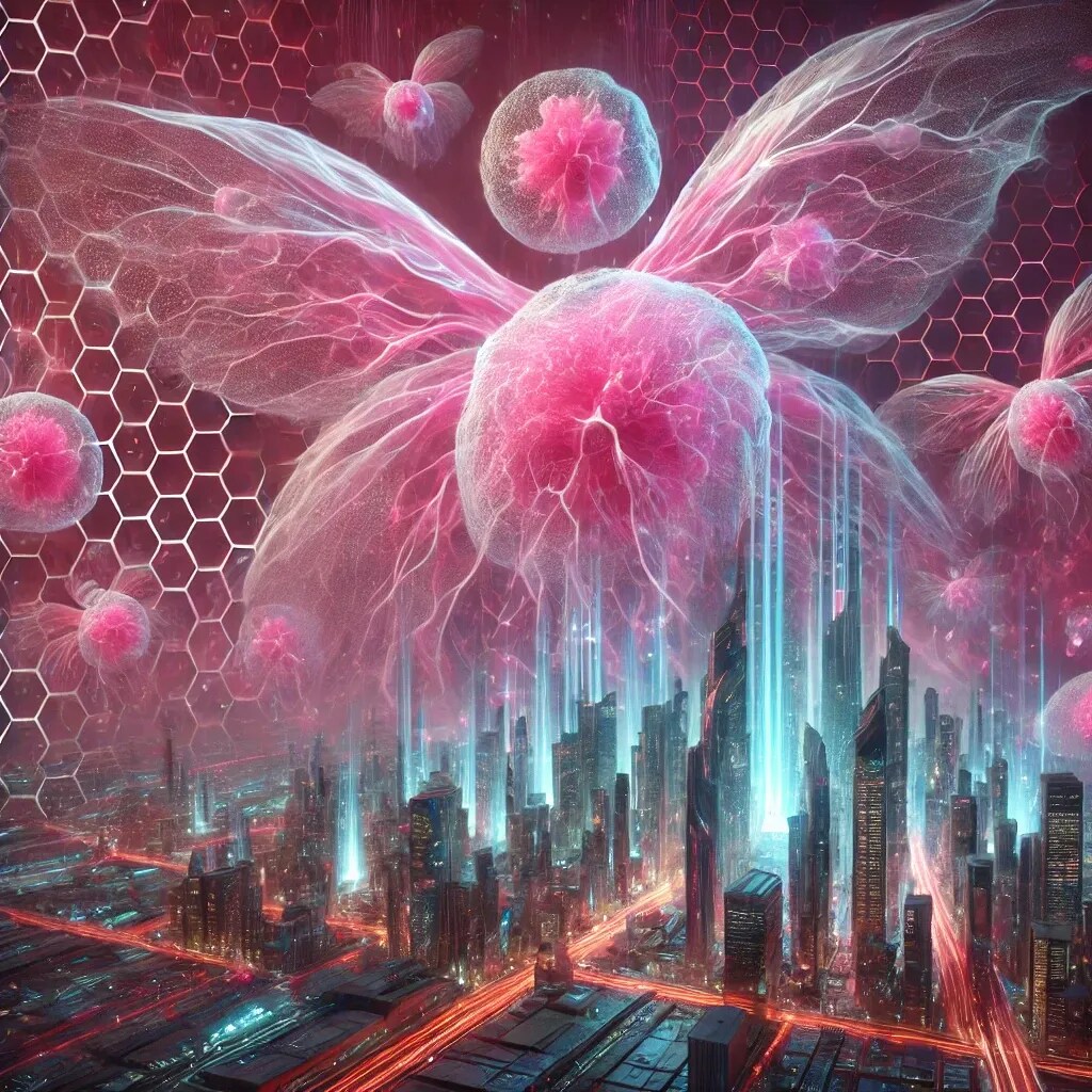 有機的な細胞と未来都市のテクノロジーが見事に融合し、幻想的で魅力的な雰囲気が漂っていますね。