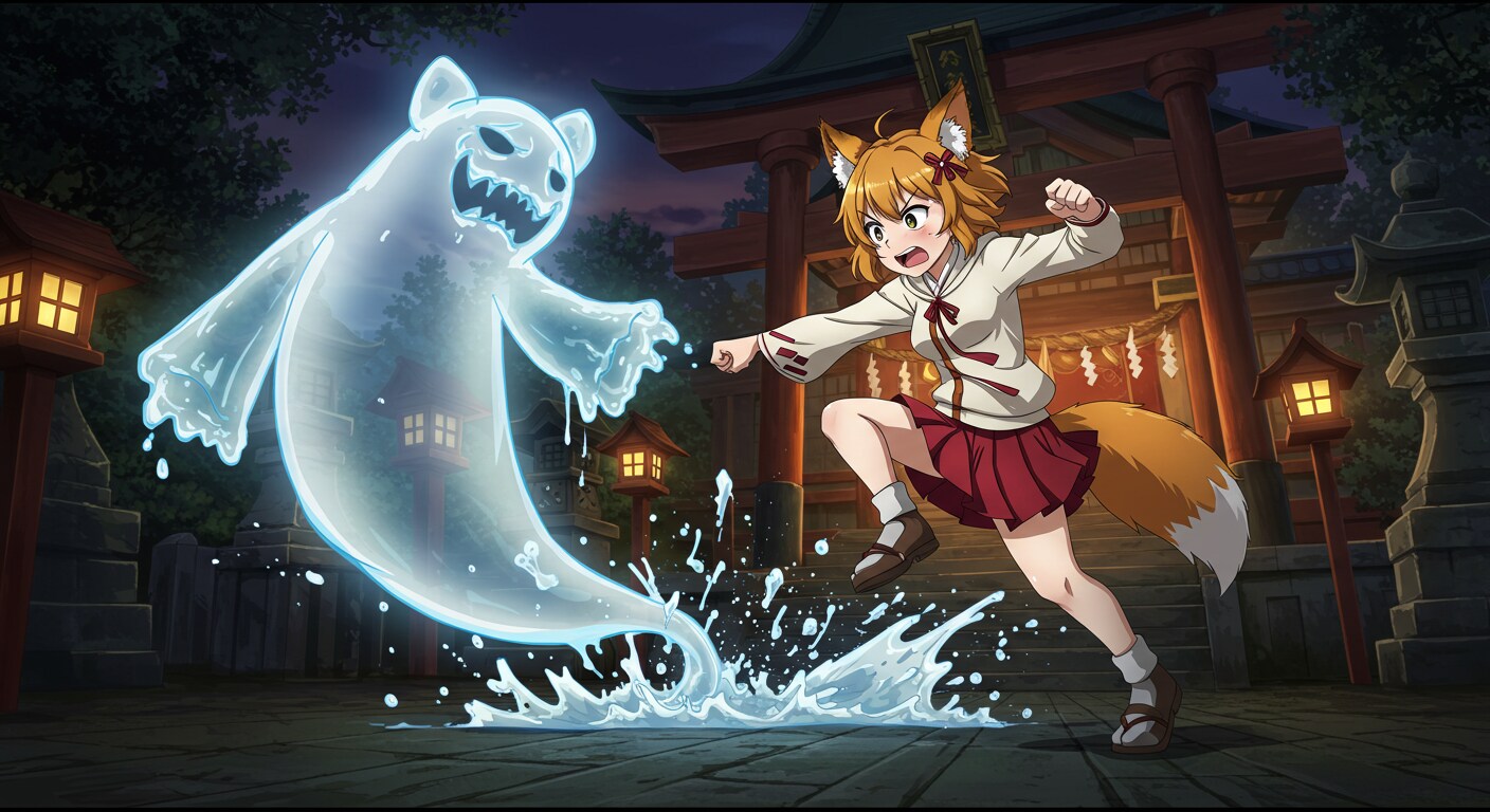 🔥 神社での狐巫女 vs 悪霊の戦いのイメージ
