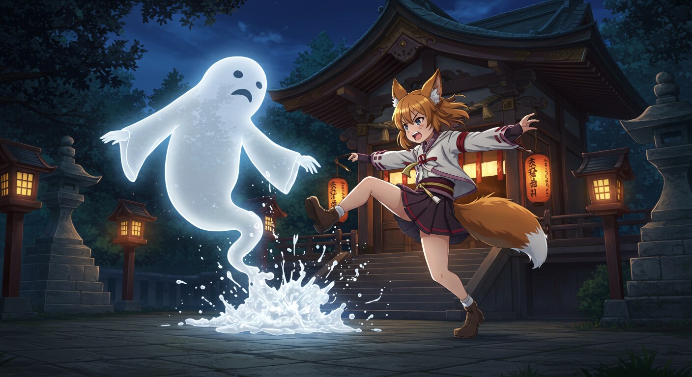 悪霊の白い霊気(エクトプラズム)が飛び散るのが、退治の迫力を増していますね。✨🦊⛩️