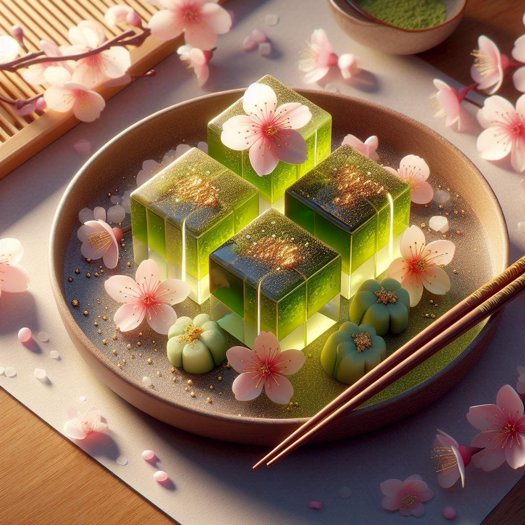 5、美しい和菓子。宇治抹茶と金粉が振りかけられている。