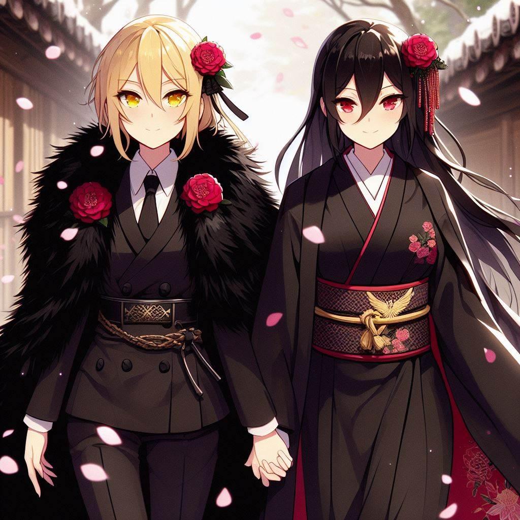 3、連れ立って桜の木道を歩く。(並ばせたら高確率で手を繋ぐかツバキがエリザベスの腕に手を添える)