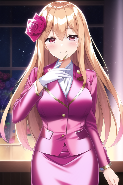いつも通り光沢感は強めに指定して生成してもらってます。この色の服装ですと、金髪が一番よく似合いますかね。