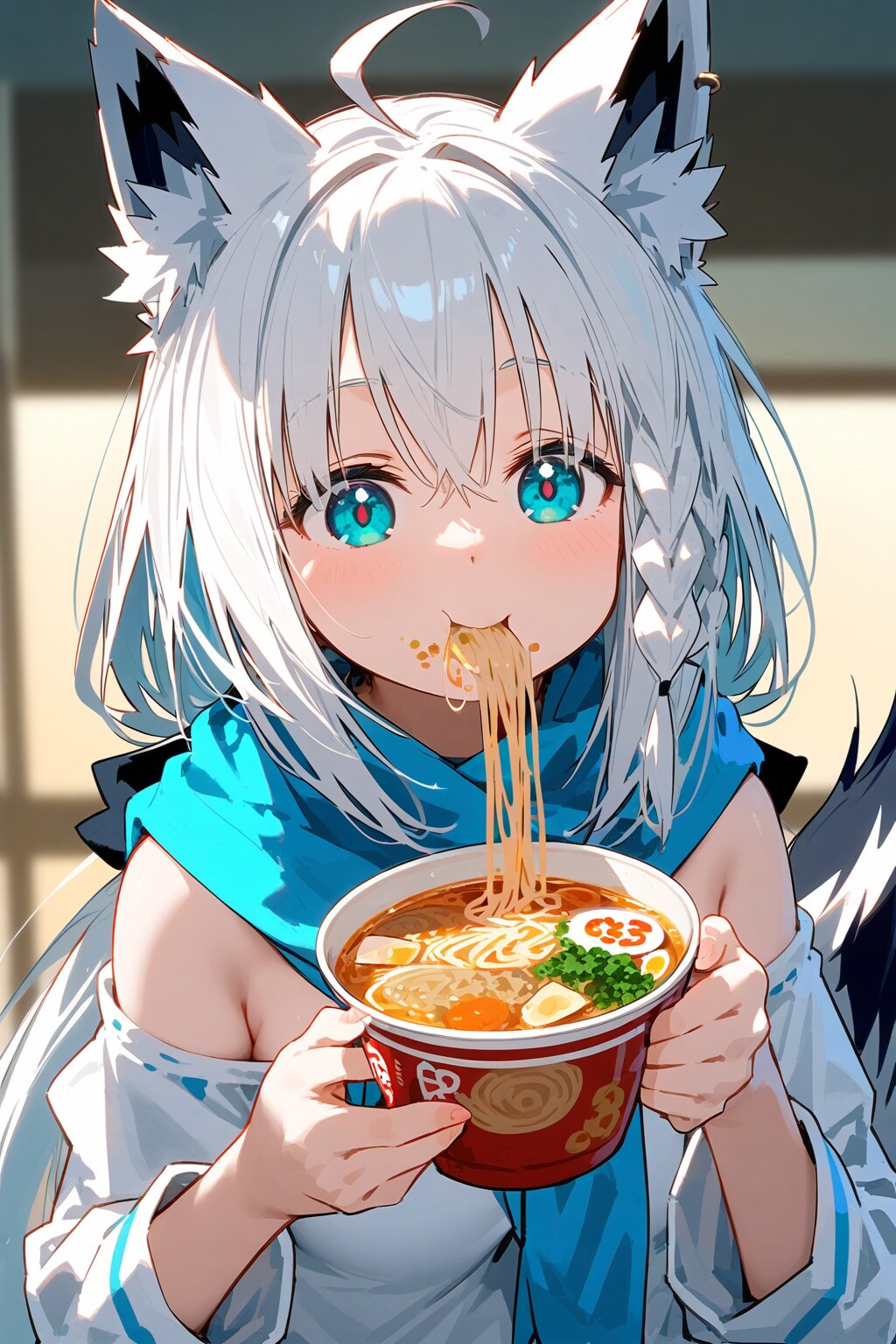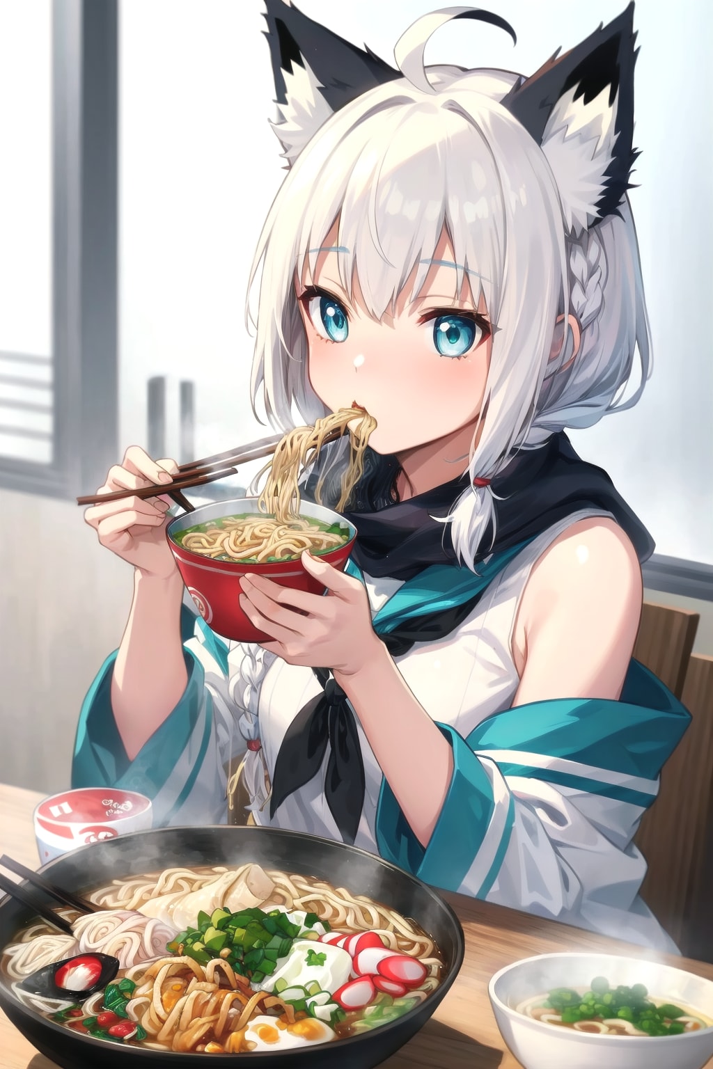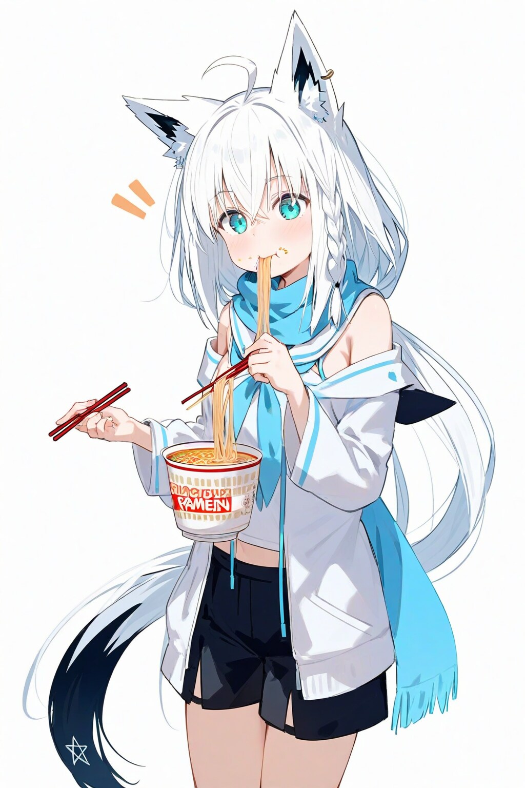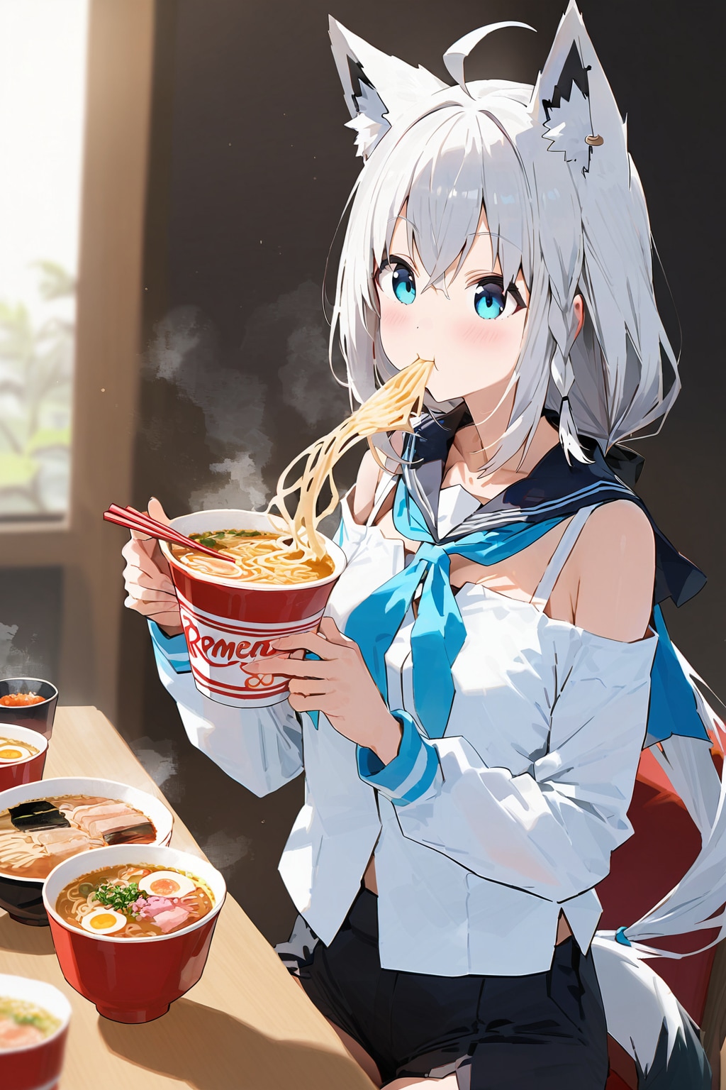 A 尾丸ポルカ(V-tuber)の2022年代の(配信外での)趣味。AIに白上フブキ(画像の子)がラーメンを食べる絵を描かせてはゲラゲラ笑っていた。元は、同年代にネットミームとなった「ラーメンを食べる樋口円香」。当時NovelAIにラーメンを食べるイラストを描かせる「AIラーメンチャレンジ」が大流行した。