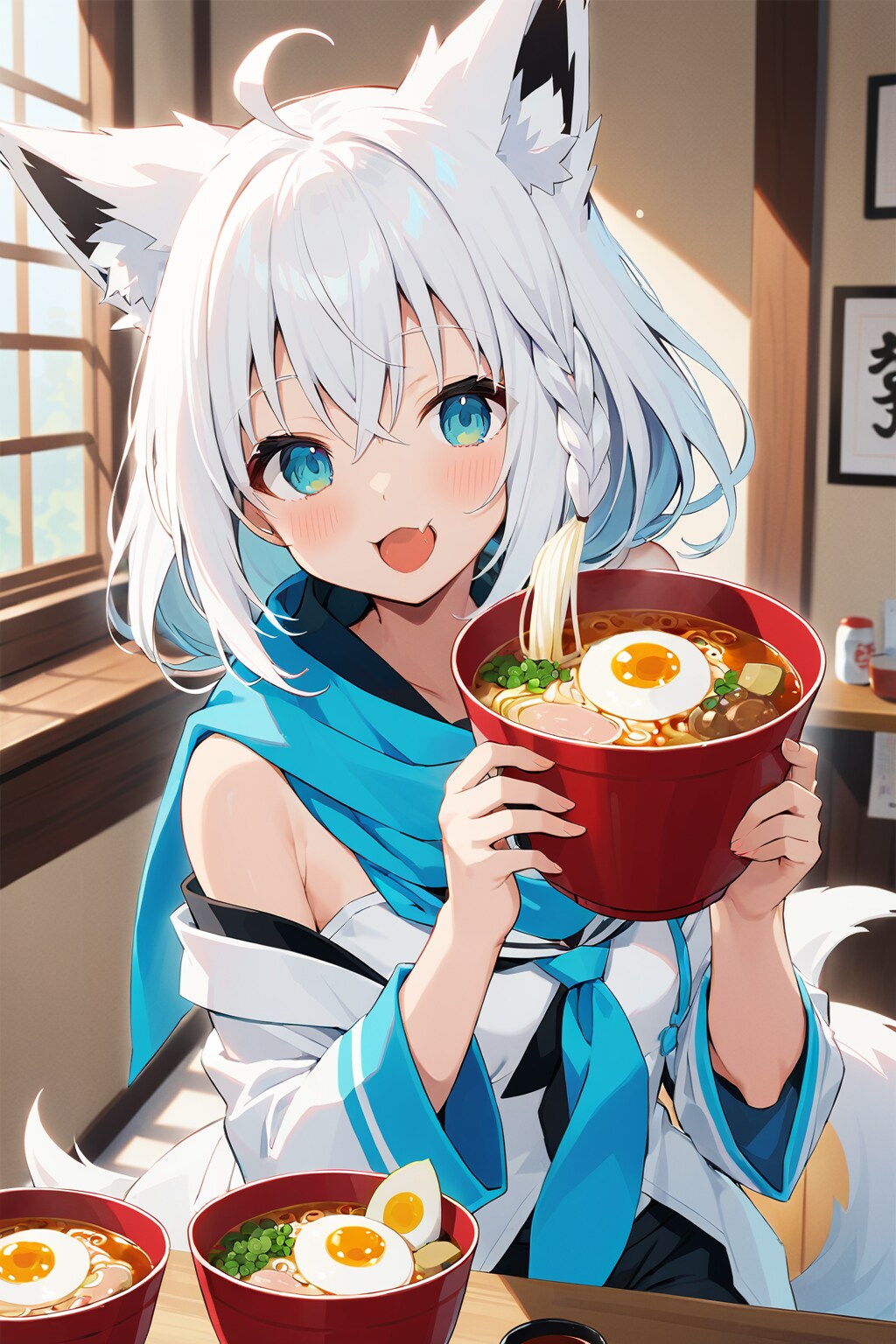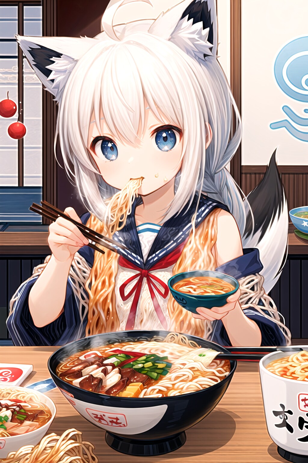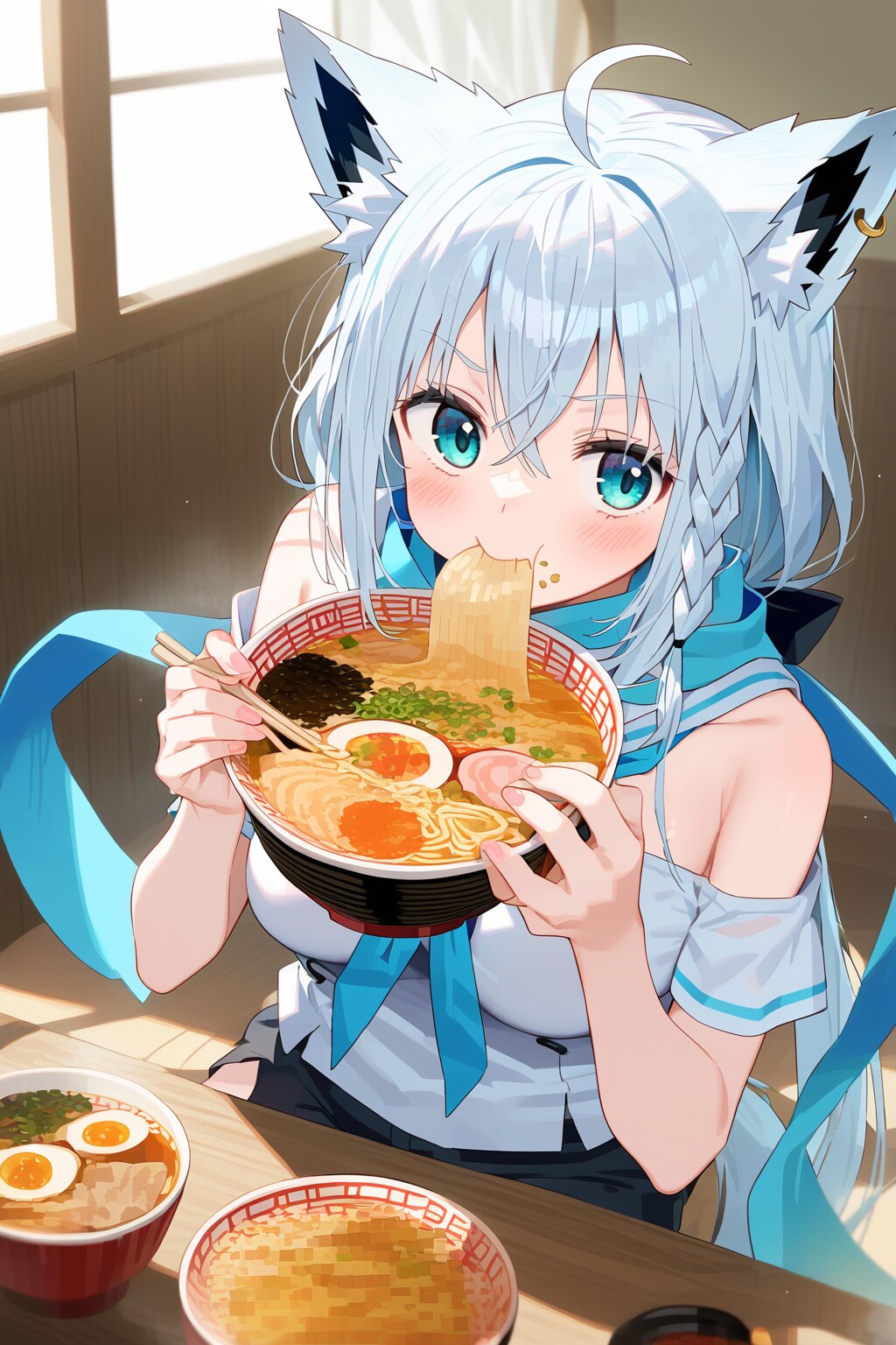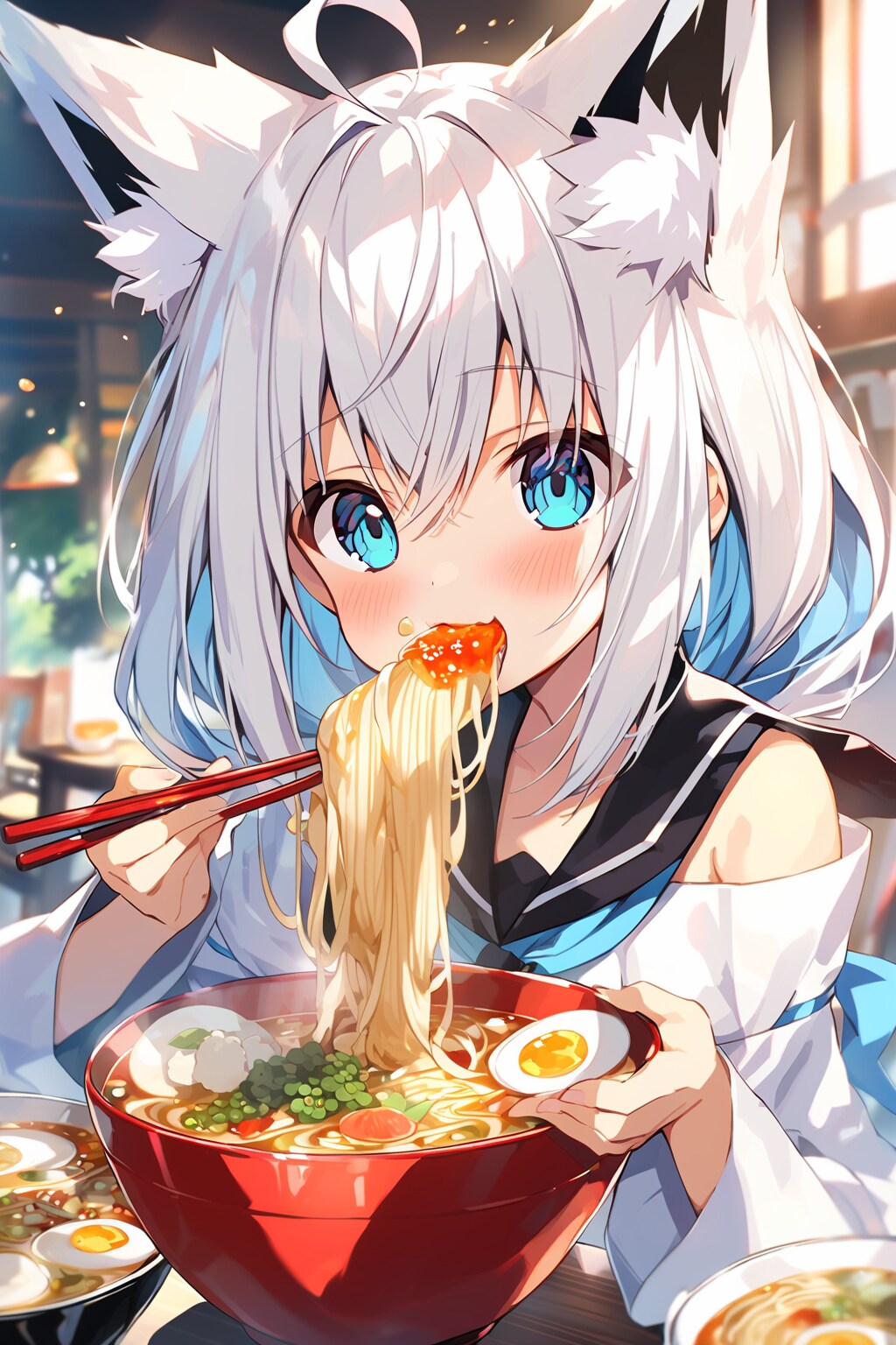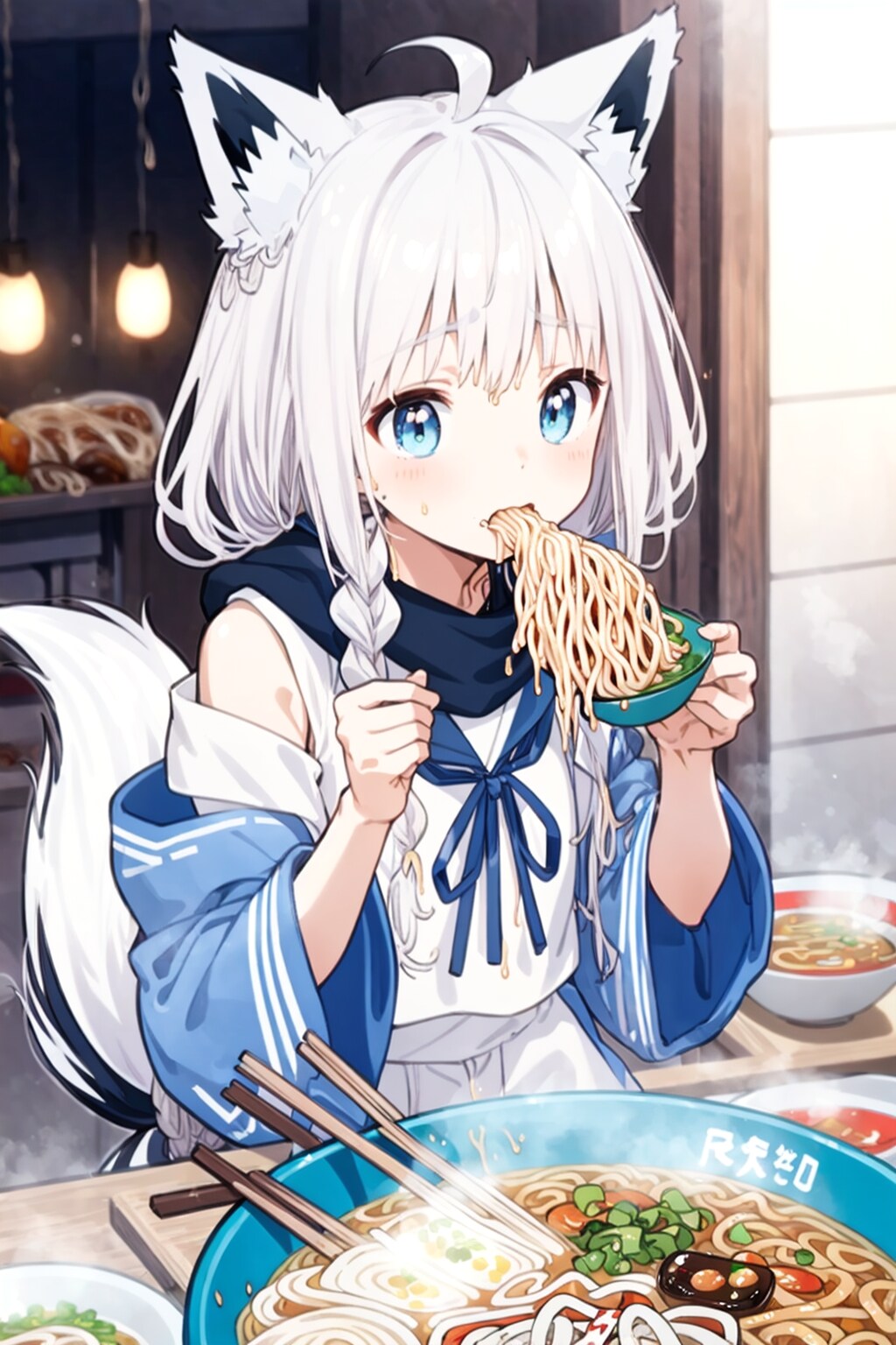 A 尾丸ポルカ(V-tuber)の2022年代の(配信外での)趣味。AIに白上フブキ(画像の子)がラーメンを食べる絵を描かせてはゲラゲラ笑っていた。元は、同年代にネットミームとなった「ラーメンを食べる樋口円香」。当時NovelAIにラーメンを食べるイラストを描かせる「AIラーメンチャレンジ」が大流行した。
