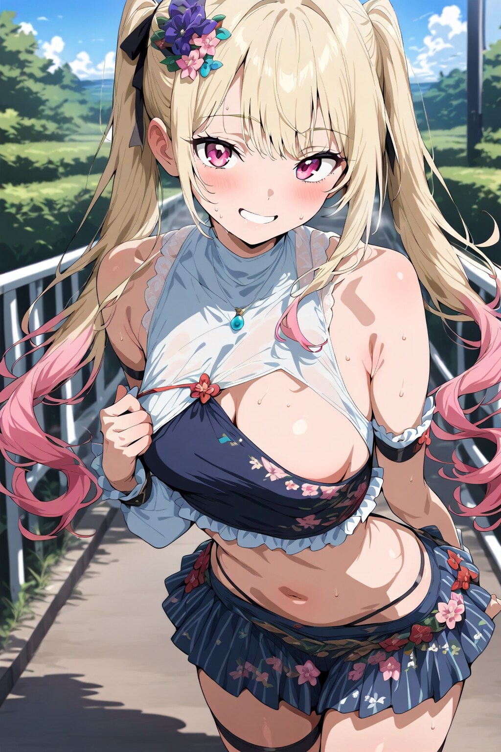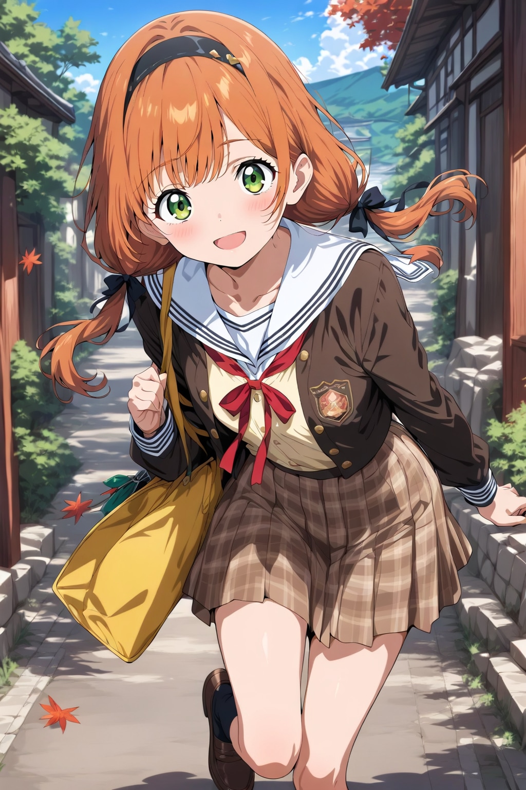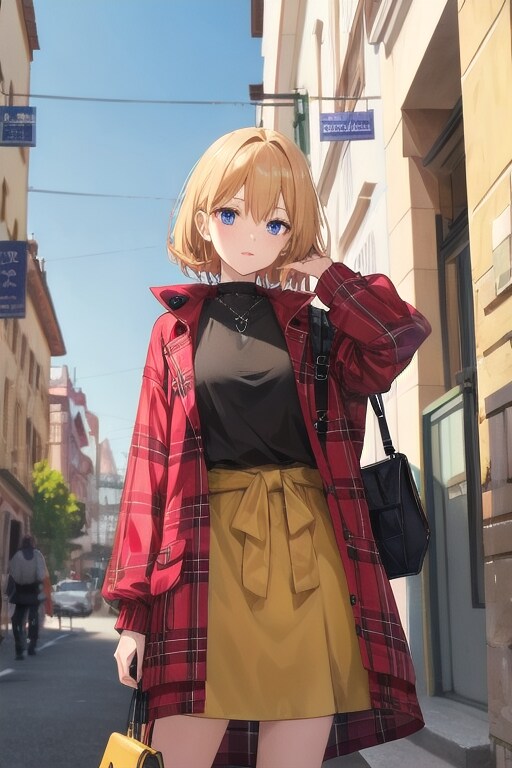 dear short cut sister, adjusting, traditional city, concrete tower, tree, person, parking, danger color inner skirt, tied ribbon navel accessory, red tartan coat, carrying pouch, travel accessory, temptation thighs,