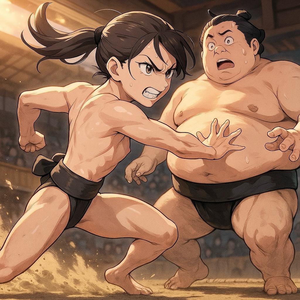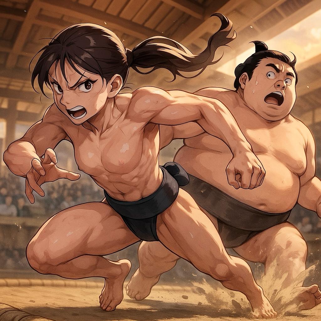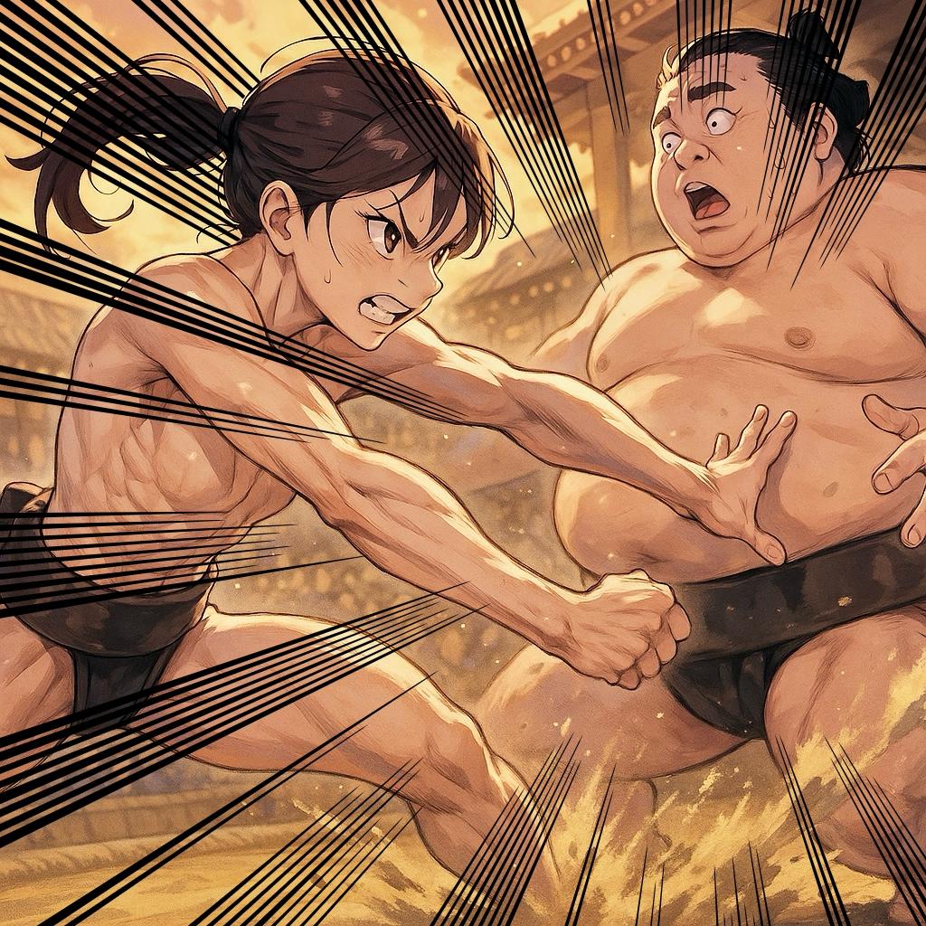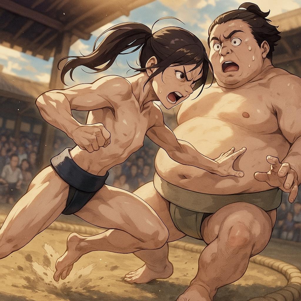 勝利の瞬間、彼女は土俵の端で天を仰ぎ、両腕を高く掲げた。