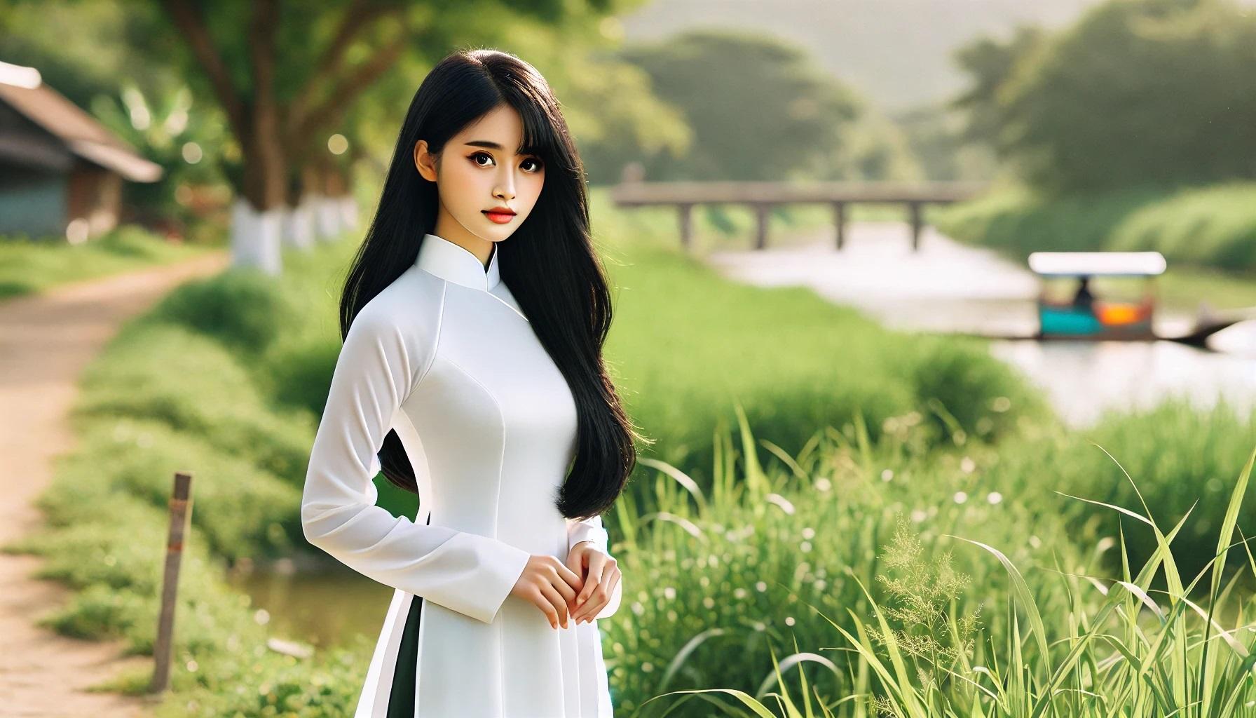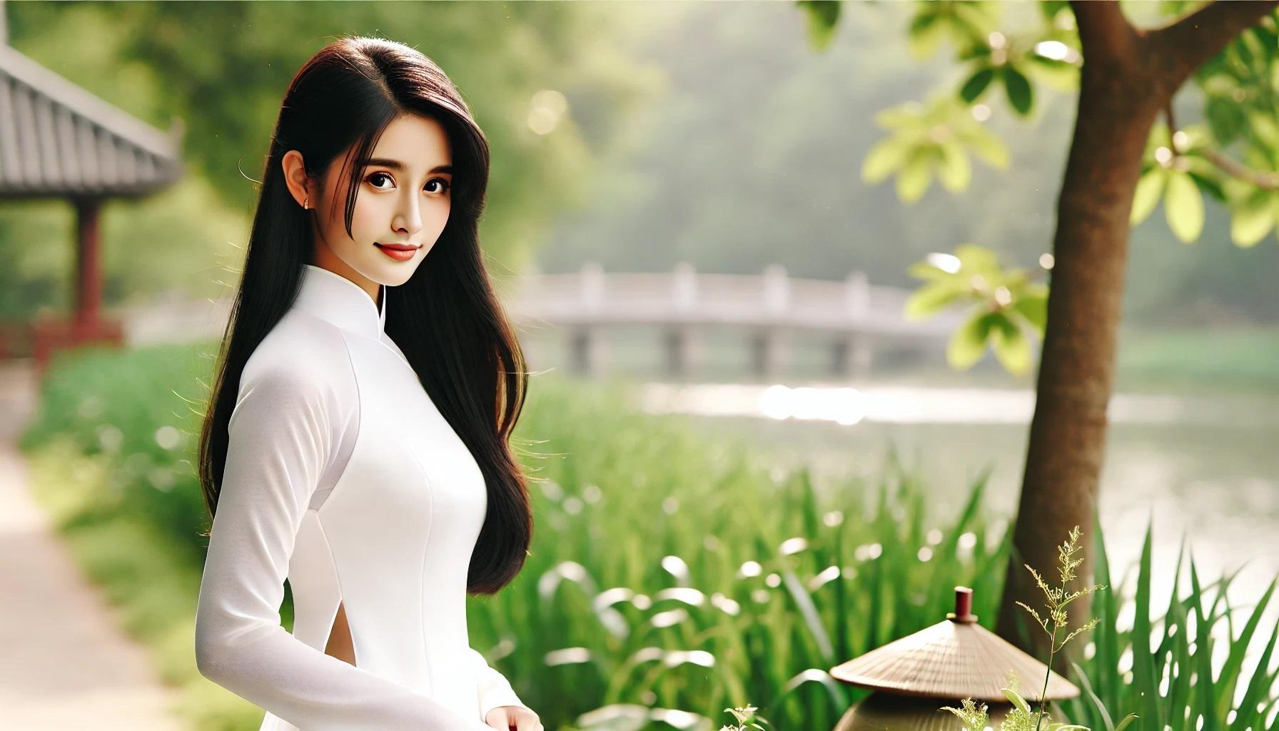 - 説明: アオザイの細身のラインがグラマラスな体型にフィットし、ロングヘアがシンプルでありながらも優美な衣装に溶け込みます。スリットの入ったデザインが女性らしさを強調し、黒髪と黒い目の清楚で知的な魅力がアオザイの白やパステルカラーと絶妙にマッチします。