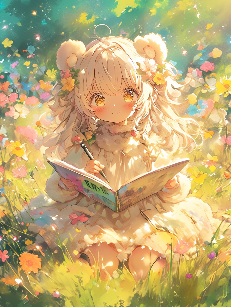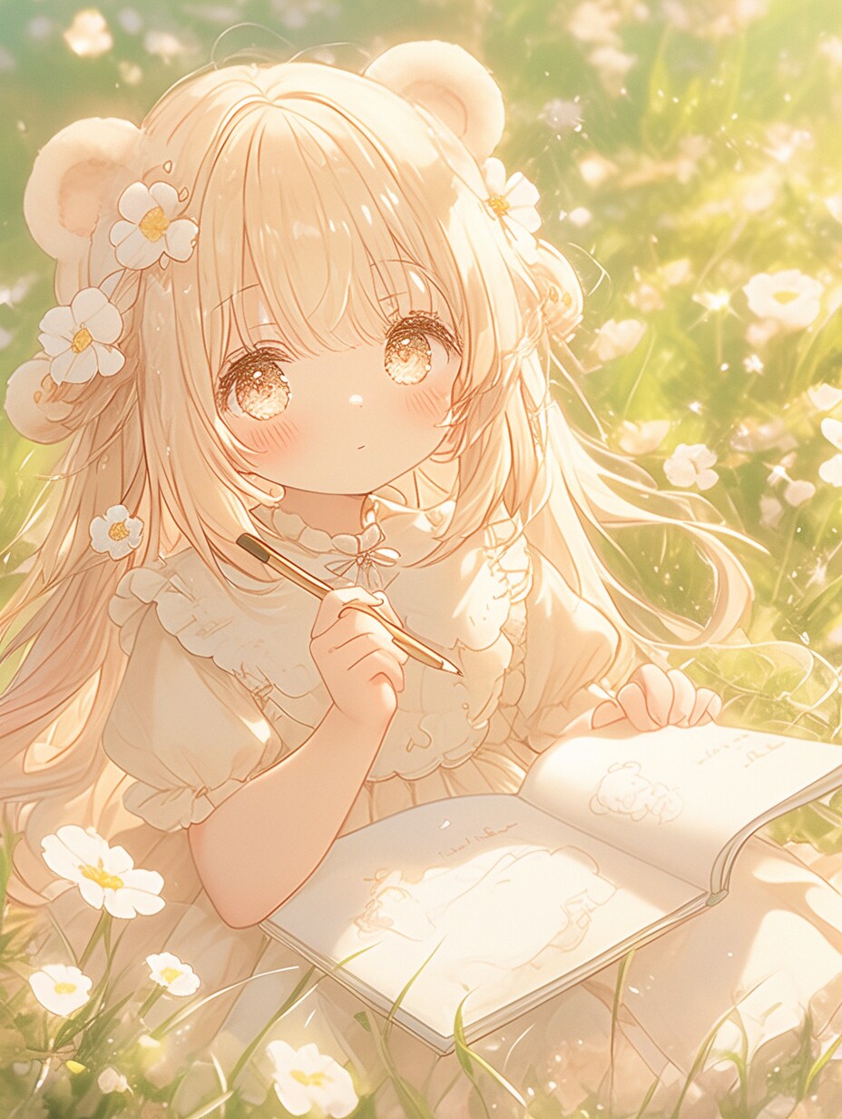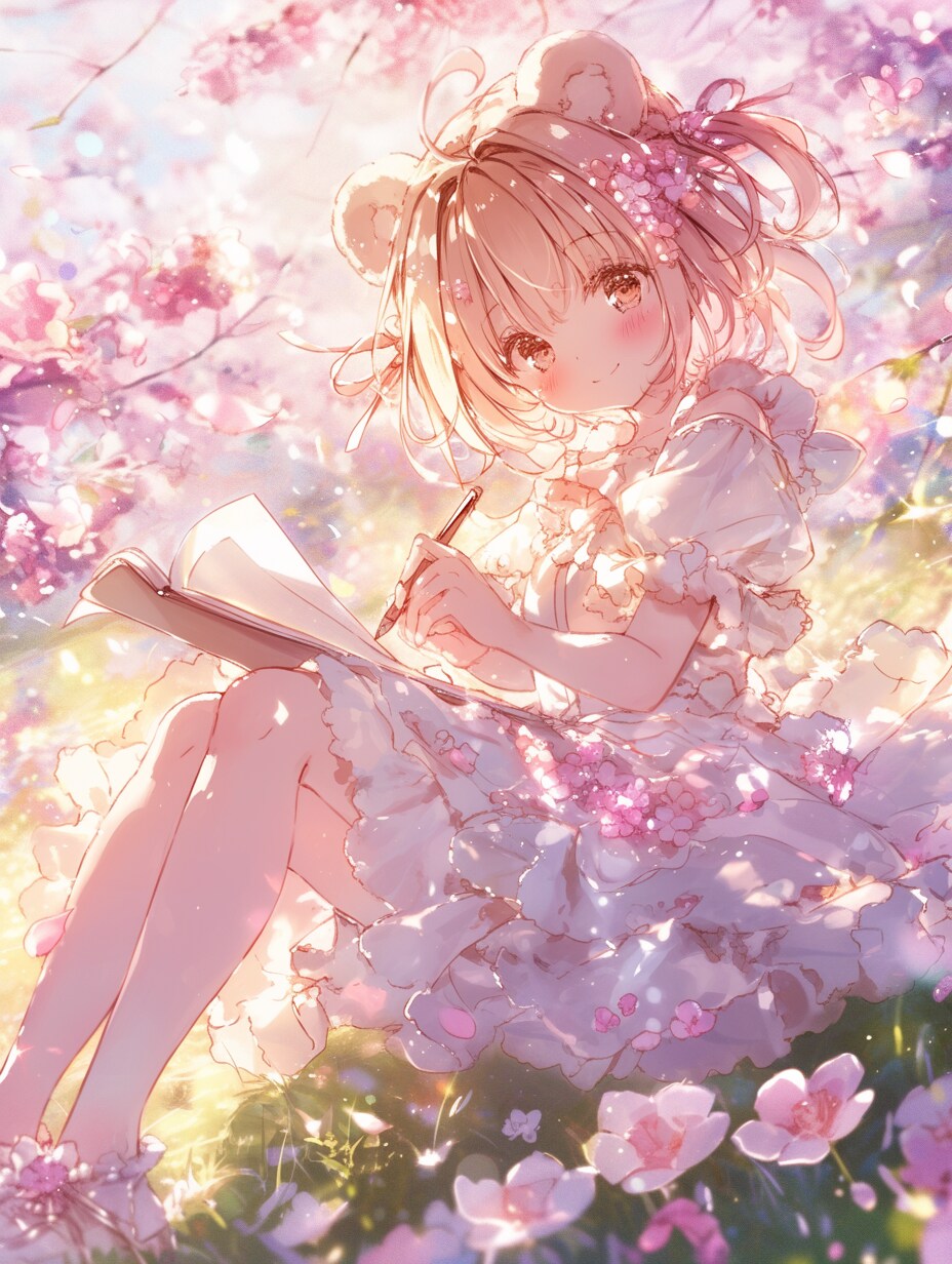 桜の花びらが舞う中で、くま娘が今日の思い出をスケッチ。
