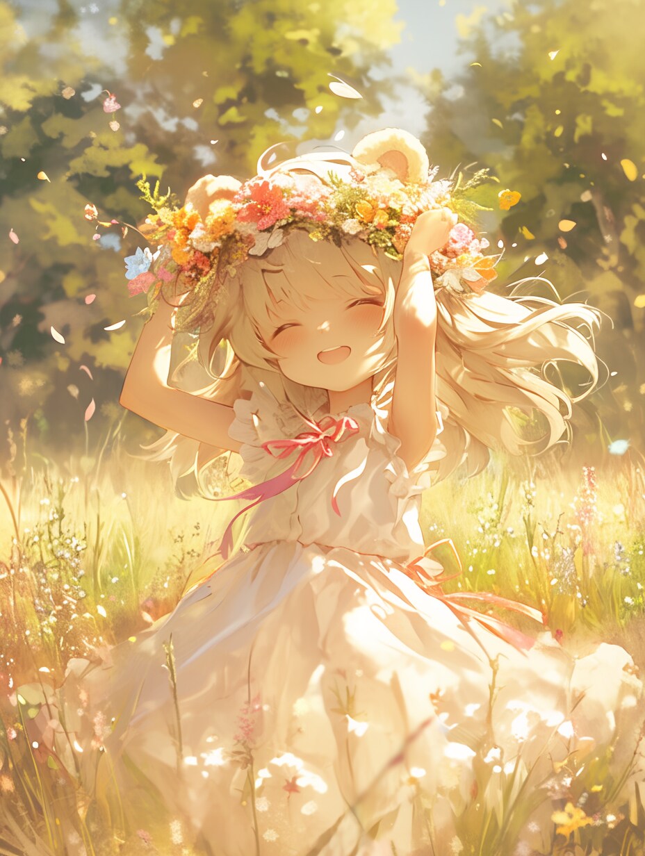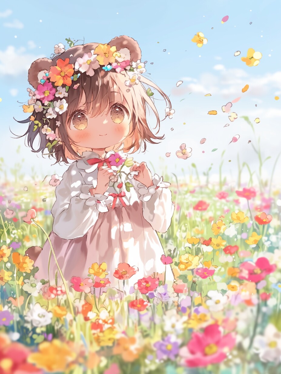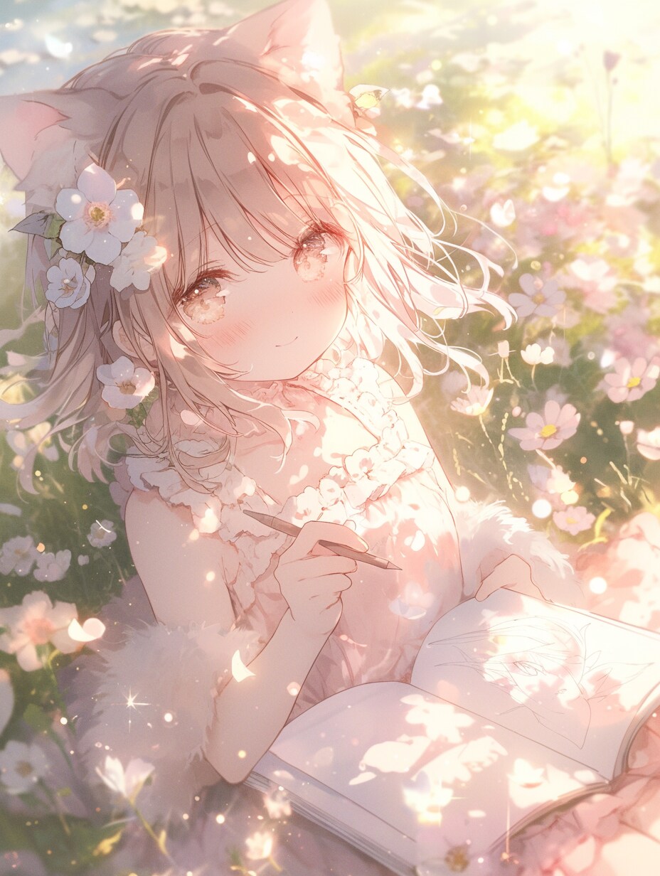 桜の花びらが舞う中で、くま娘が今日の思い出をスケッチ。