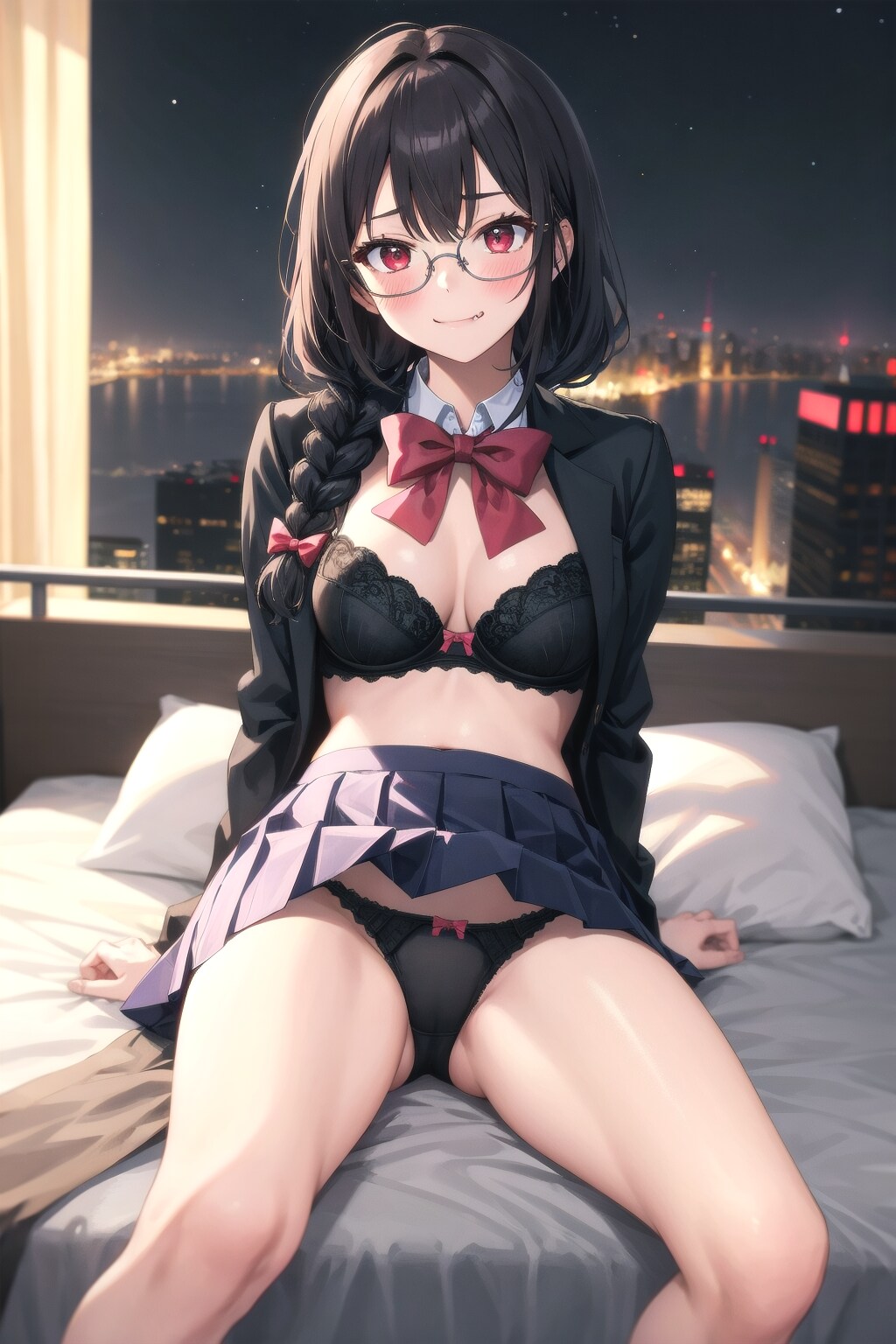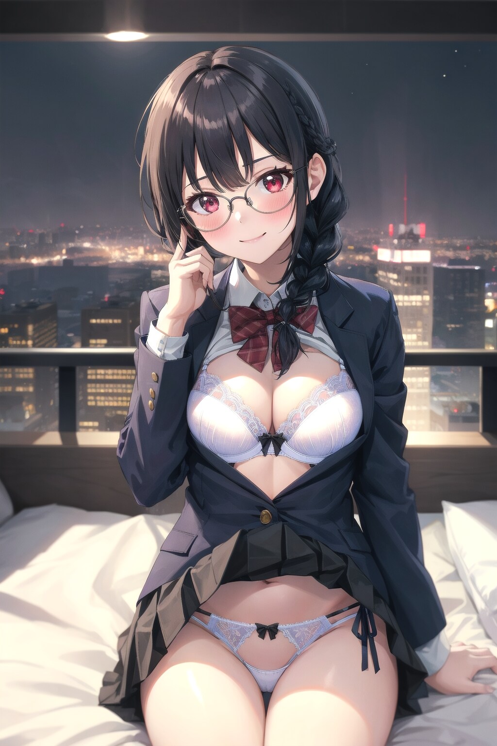 基本的に優等生からの下着姿のギャップを狙った作りですね。V4Bでは下着表現で悩むことが多いのですが今回は良い感じで作れたかな、って思います。紐パンはプロンプトで意図的に指示したのは初めてですね。今回背景はいくつか案を試してみて最近よく使う高層階からの夜の都会の眺望で。キャプションが書きやすくなりました。