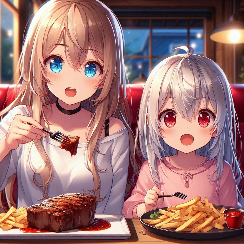 肉を食べている。この様子じゃいつもの姉妹戦争はなさそうだ💦