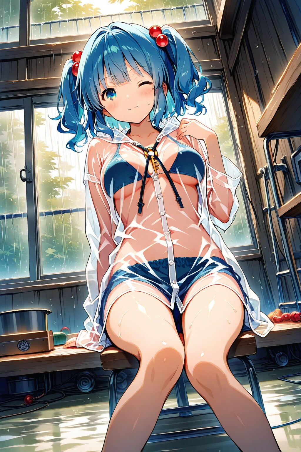 「なんで合羽を着てるのか不思議そうだね。これは開発中の超高速乾燥機能付きの合羽さ」