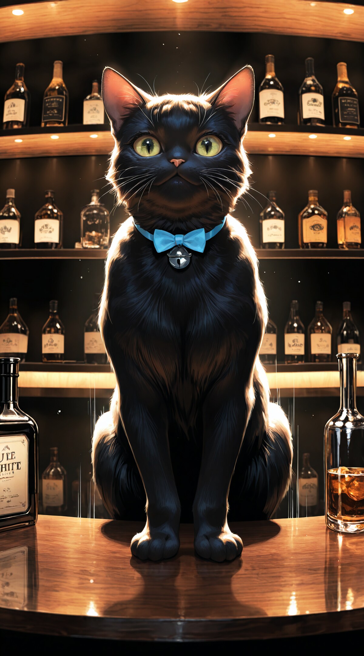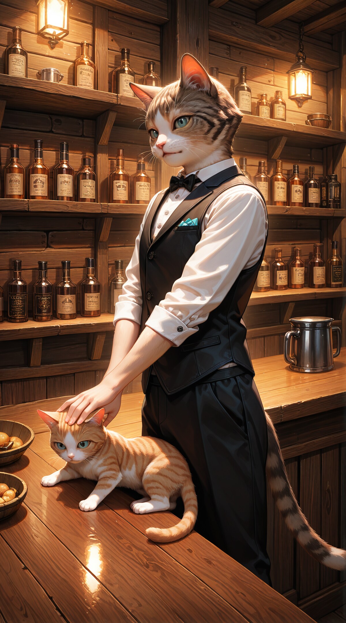 >しっとりした照明のバーに、スーツ姿の大人っぽい猫さんがバーテンダーとして立っていて……