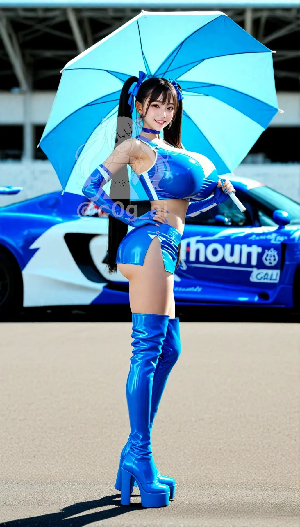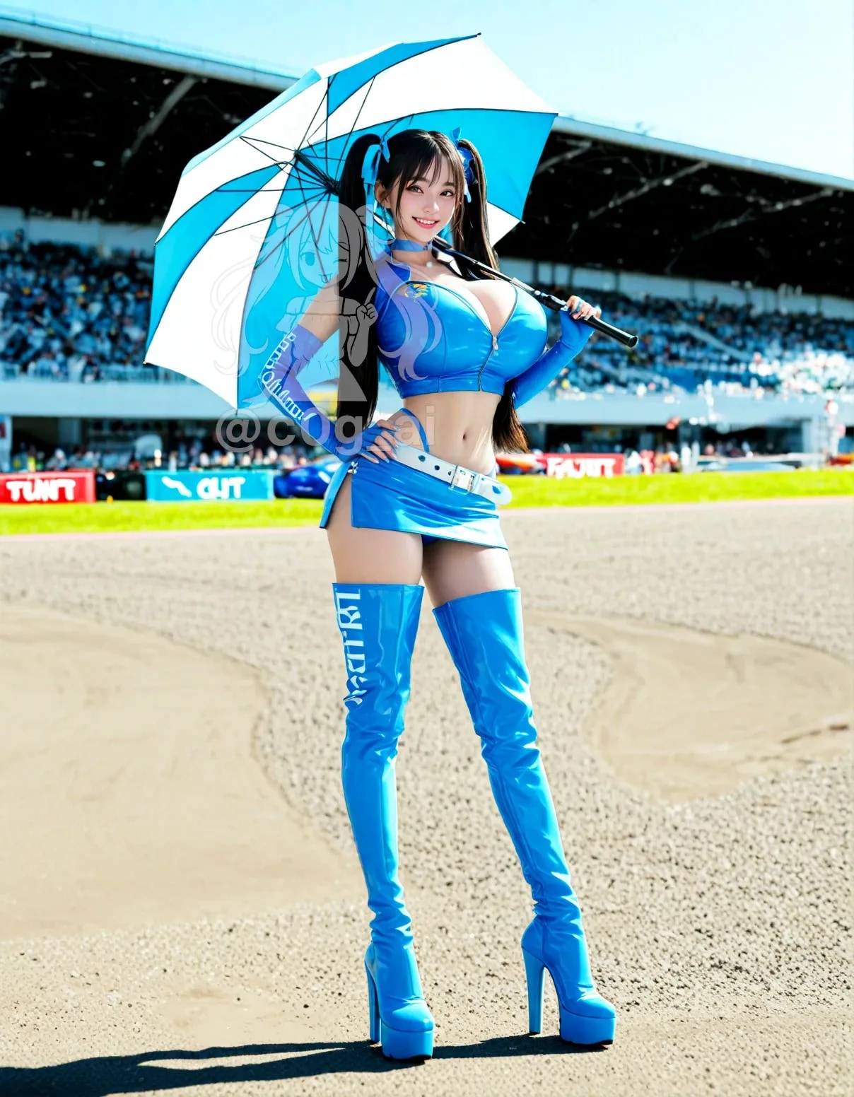 1枚目は、これまでにないくらいポーズとレースカーの構図がハマっていて、コスチュームの素材感や、マシンの光の反射までとても綺麗に出せたと思います。