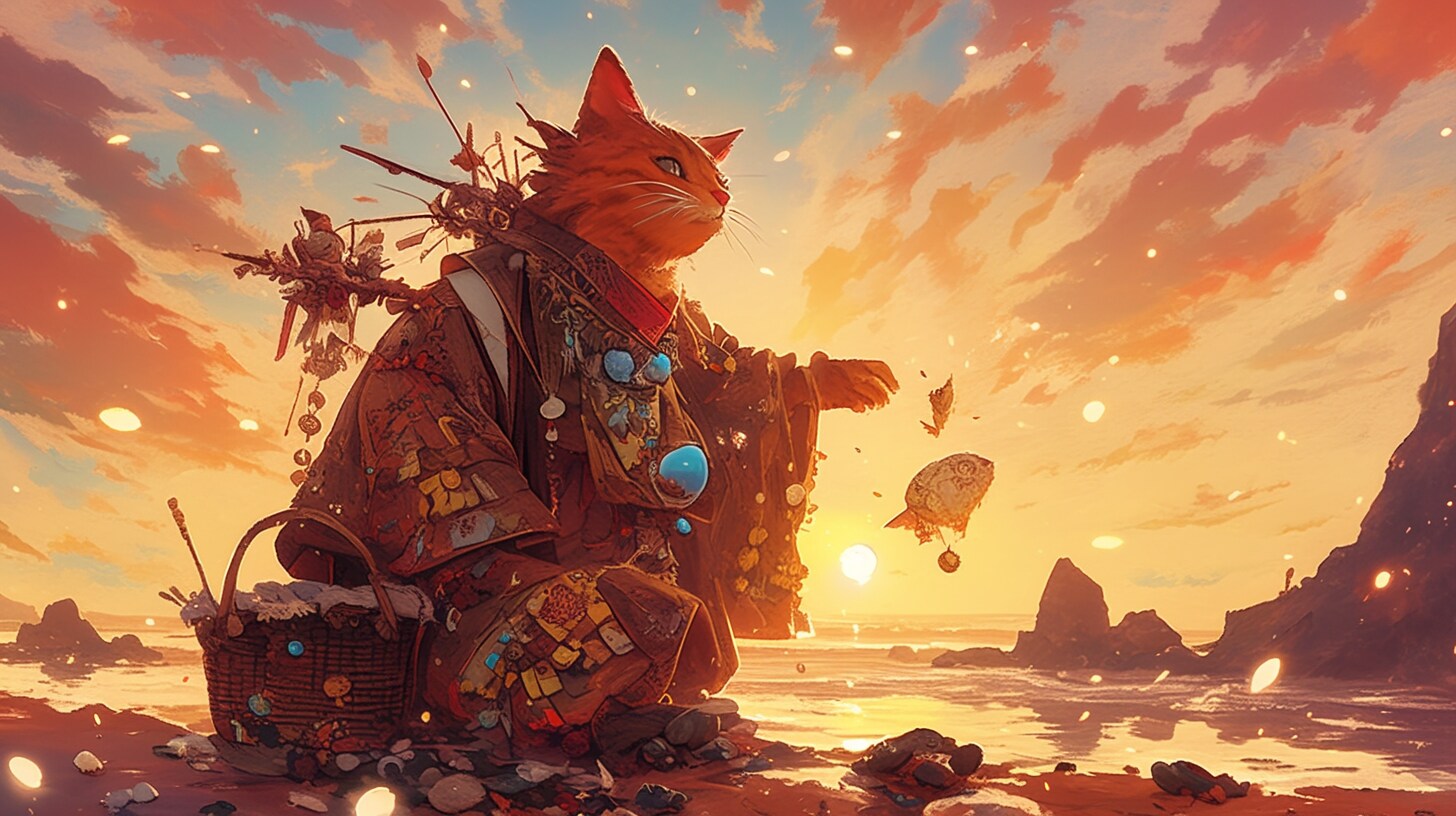 宝飾を纏いし夕陽の猫導師――黄金の浜辺に響く、神秘の旅の祈り