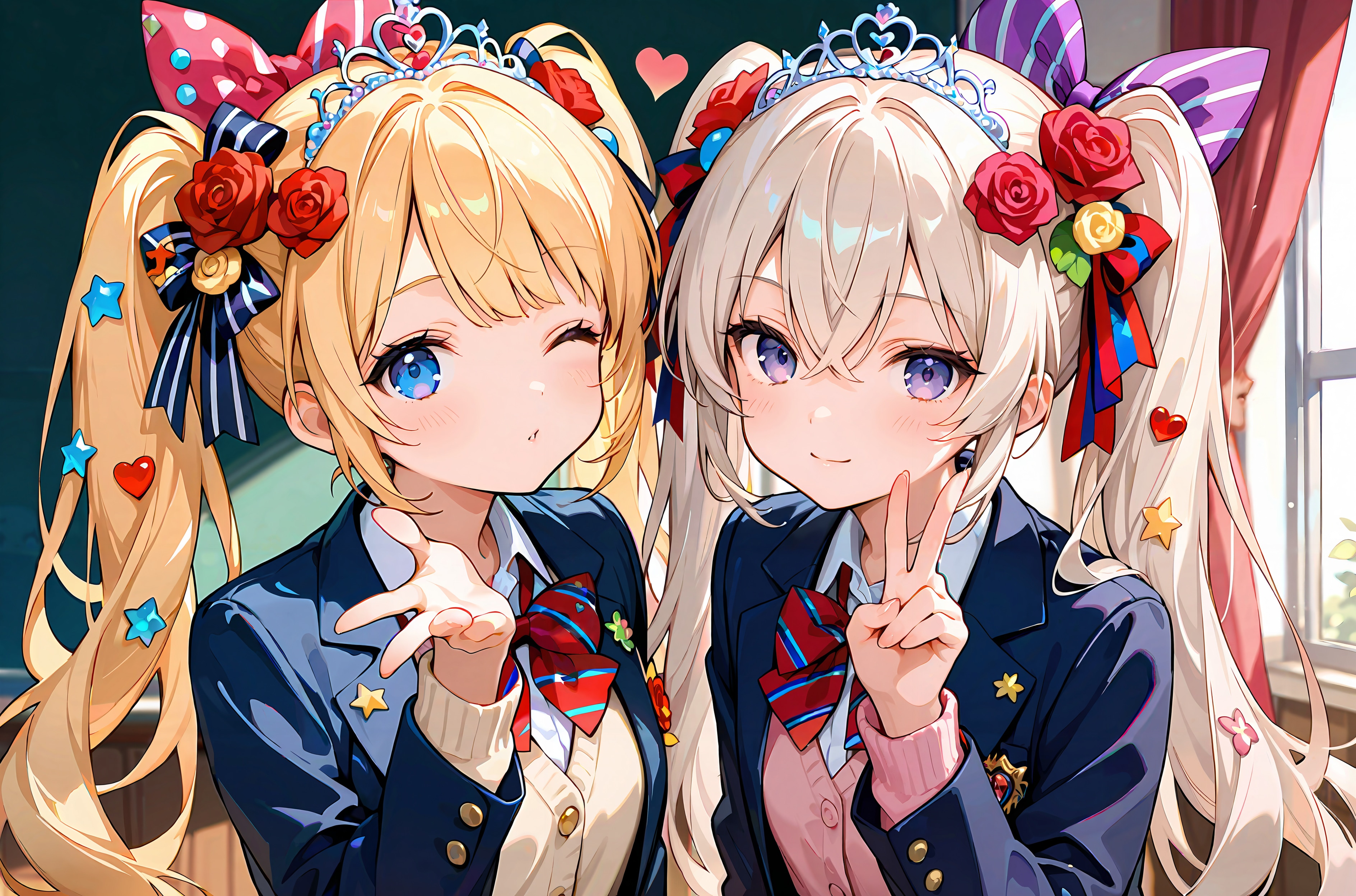 盛り髪のボリュームと、リボンやティアラの飾りが光を受けてキラキラと映える。