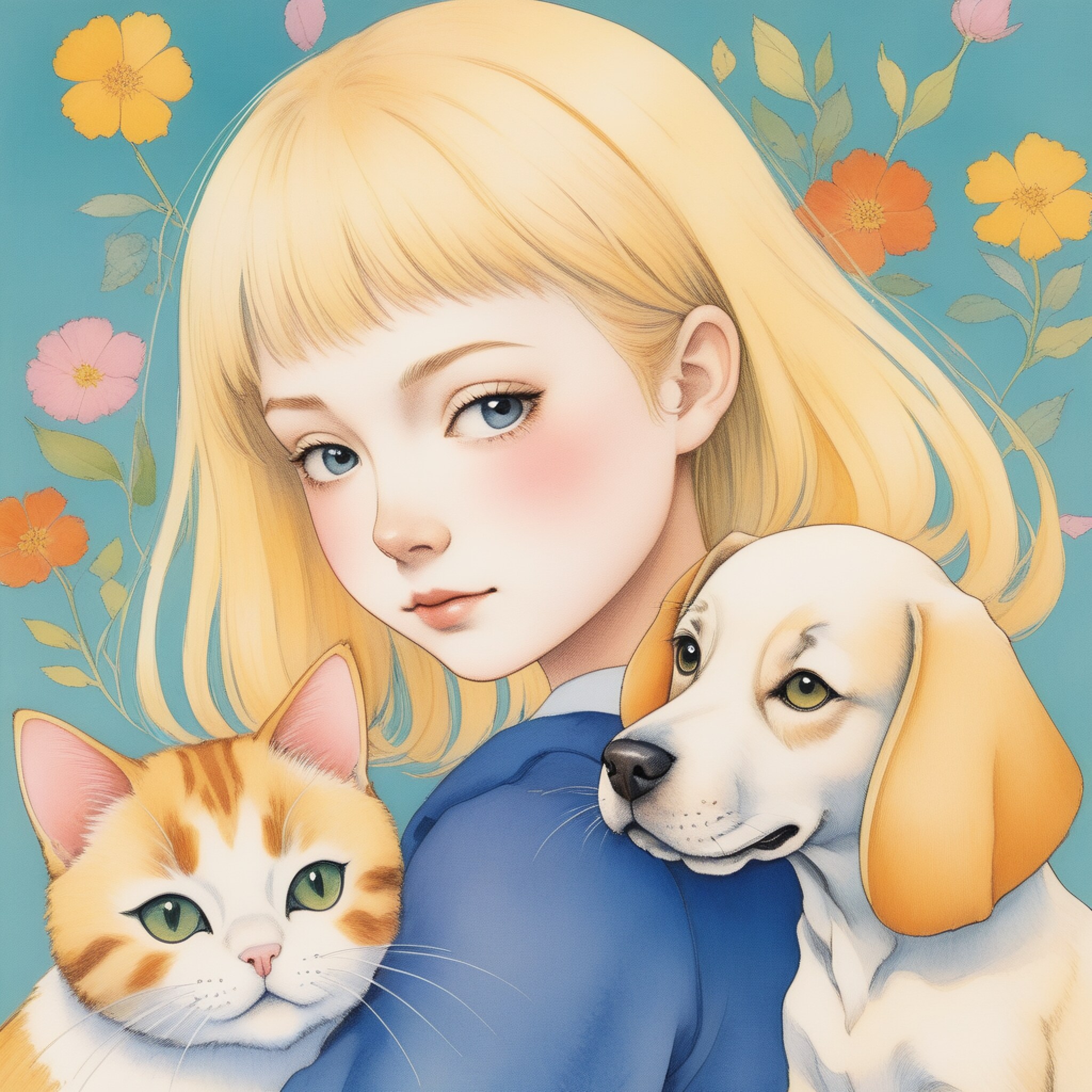 ぱっつんヘアの金髪美少女と茶トラと犬