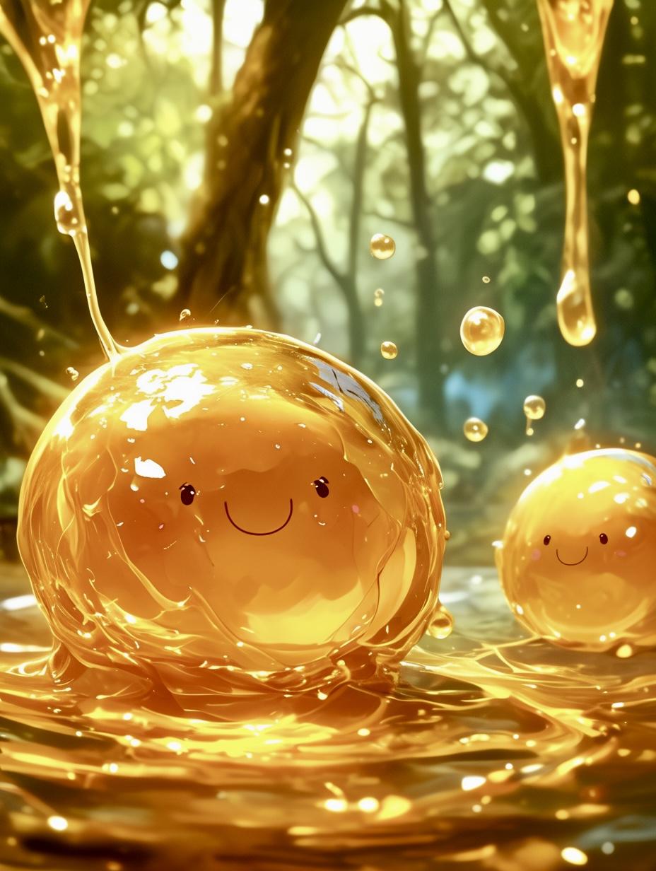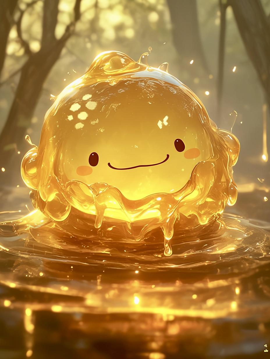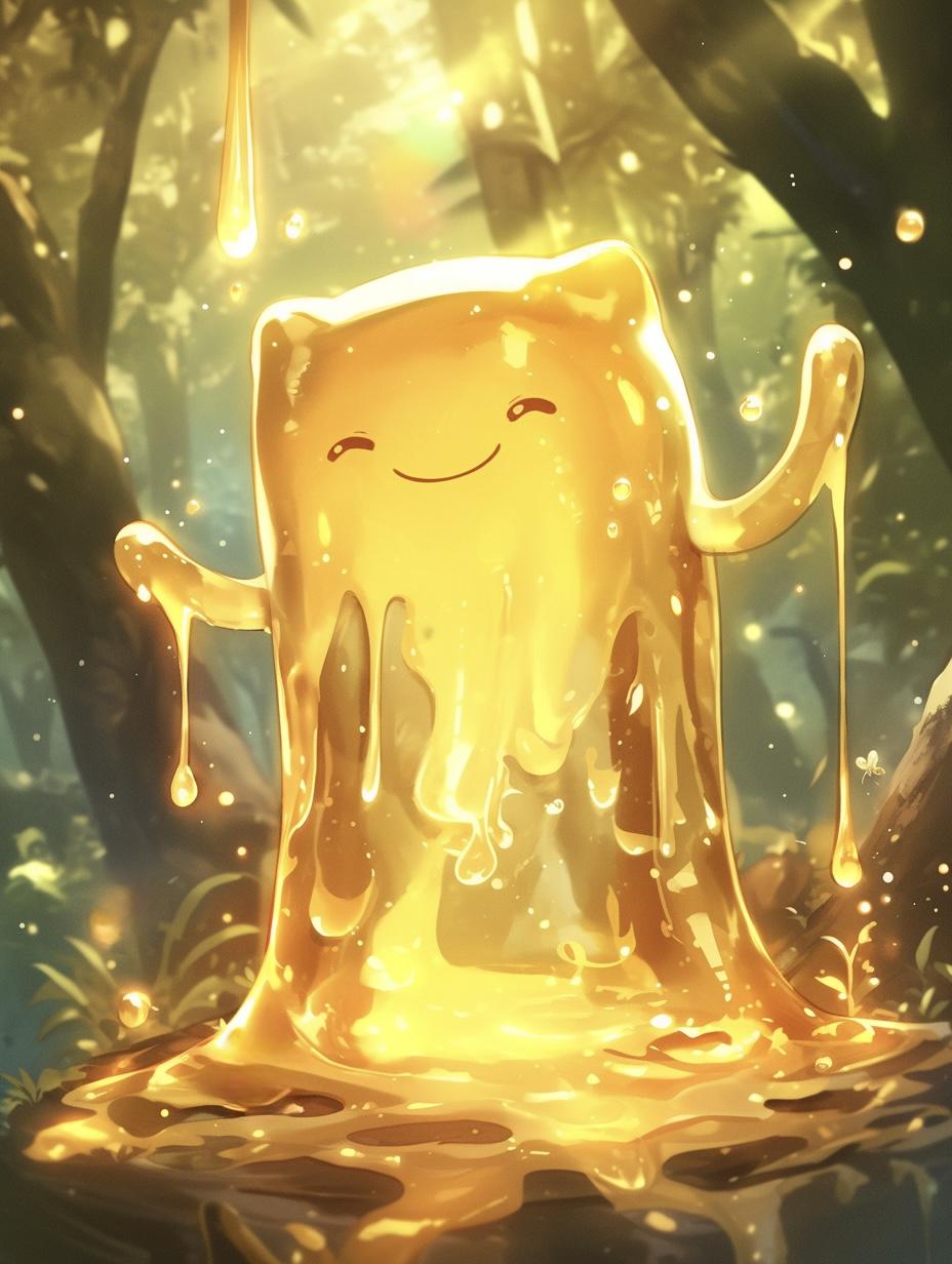 滅多に出会えない珍しいスライム。黄金色に輝くその体は、まるで液状の宝石のよう。動きは遅いが、攻撃すると体が粘りついて武器を重くし、戦闘を長引かせる厄介な存在。倒すと貴重な「純粋はちみつ」や「蜜の結晶」をドロップするが、非常に逃げ足が速く、捕まえるのは至難の業。その甘い香りにつられてくま娘を呼び寄せることもあるとか。