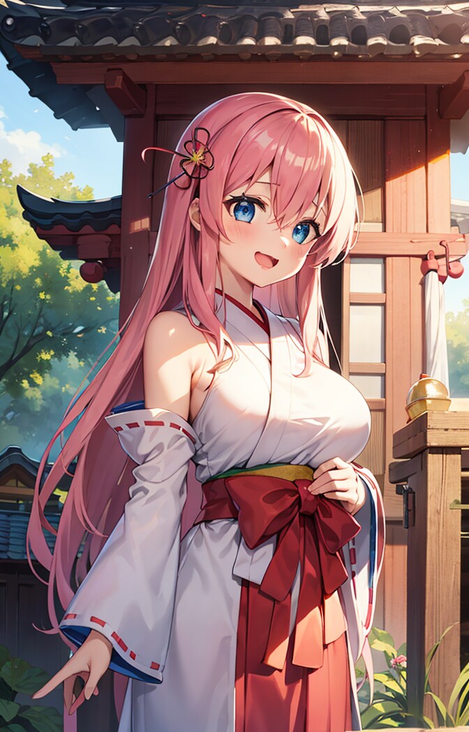 9:(((shrine maiden)), outdoor, shrine, 巫女さん。ほぼ肩だし衣装になる。頭に飾りが付きやすい。
