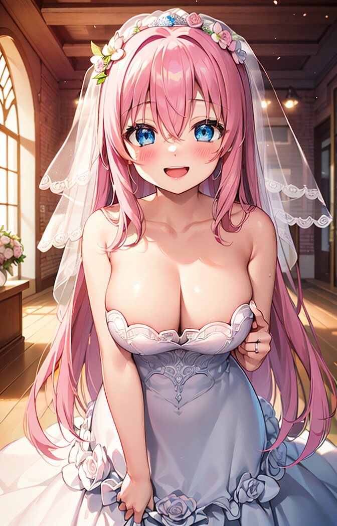 12:(((bride)), indoor, Wedding hall, 花嫁さん。ドレスの形は安定しないが、ウエディングベールはだいたい付いてくる。