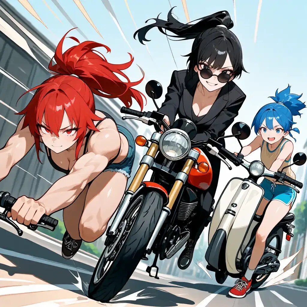 そして、赤ぽにちゃんは――ただの自転車で彼女たちに並走している。しかも余裕の笑みを浮かべながら。