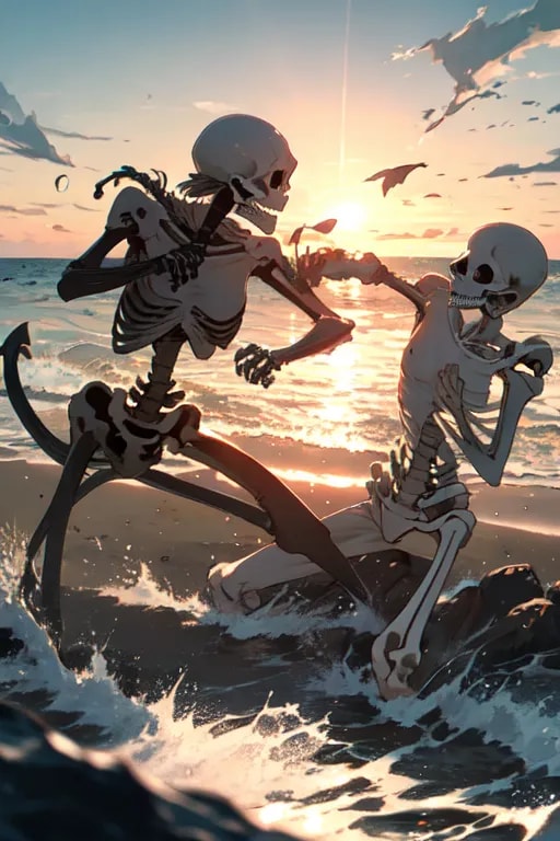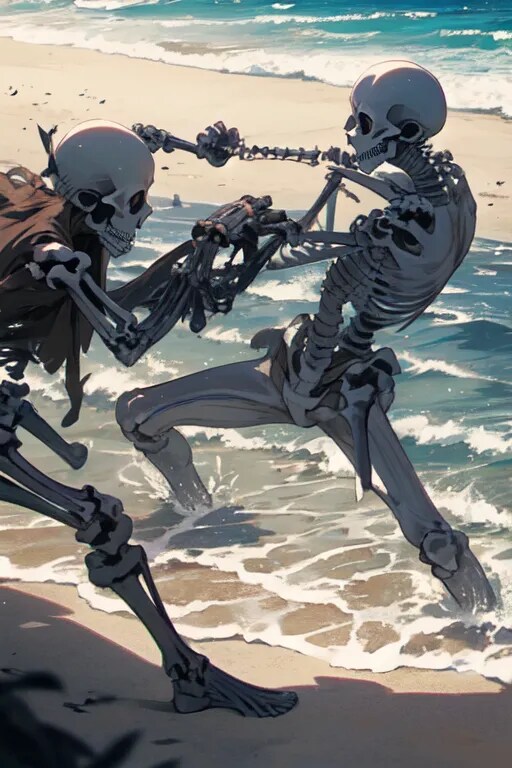 海岸で死闘を繰り広げる2人の人骨戦士。夜通しの闘いでも2人は膝をつくことすらない。