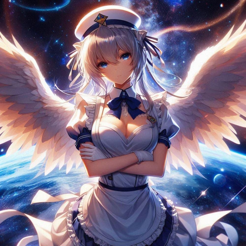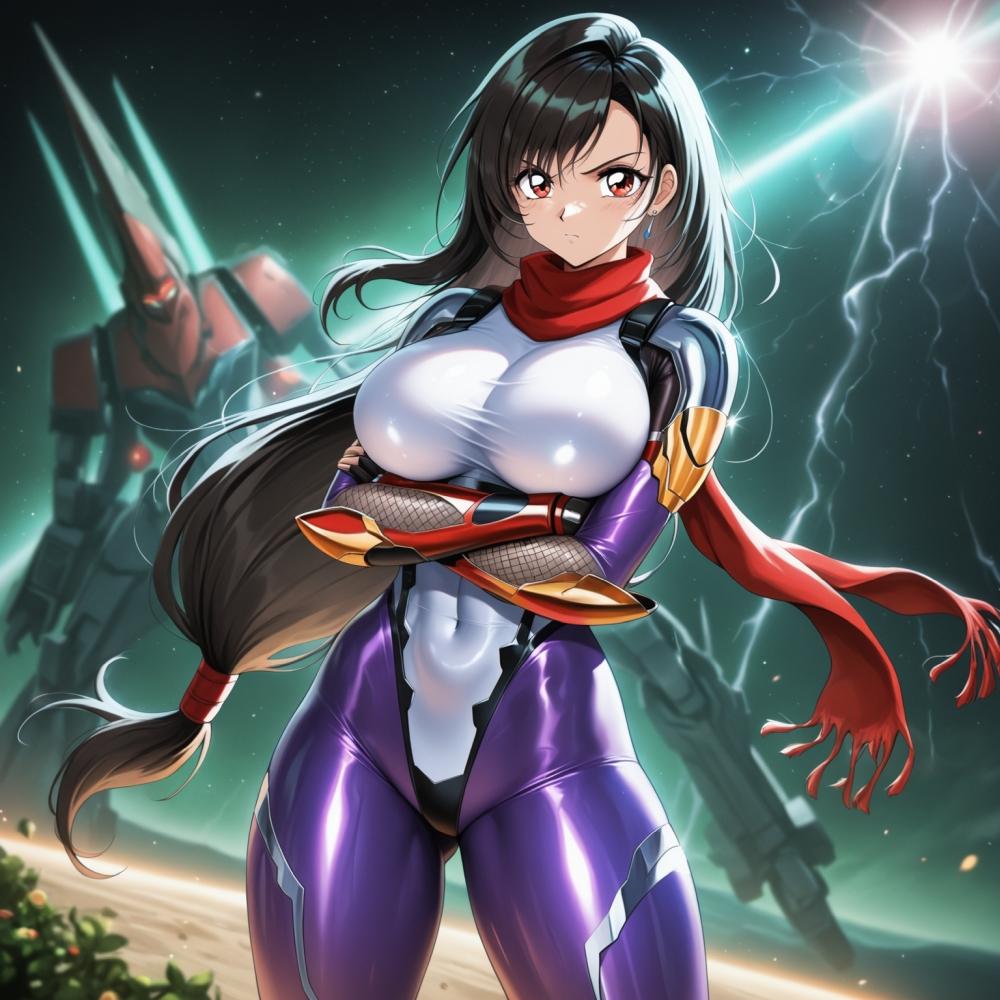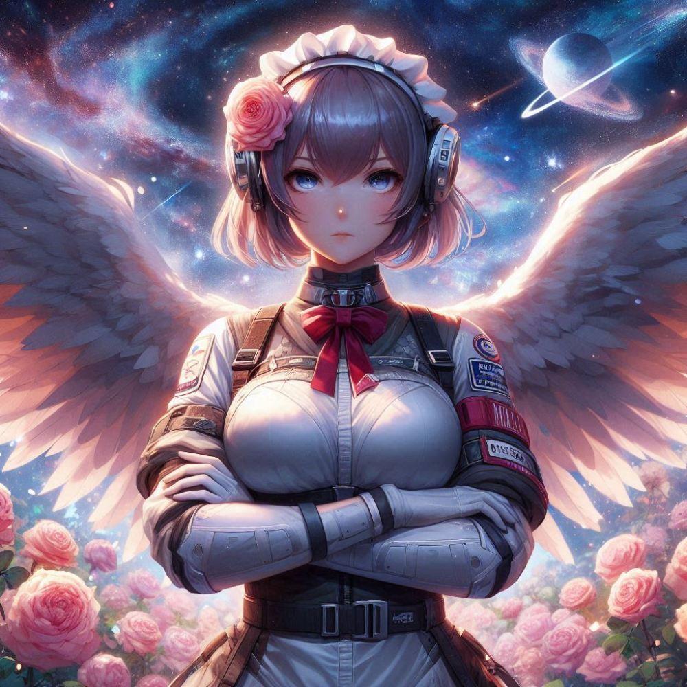 1990年代風アニメ風、薔薇と天使メイドパイロットスーツコスプレ人妻仁王立ち
