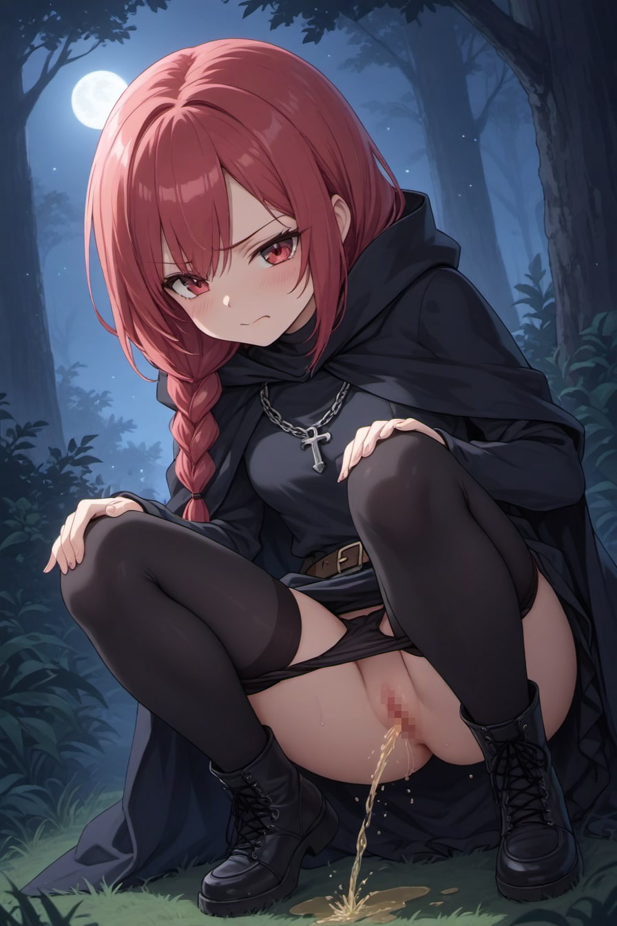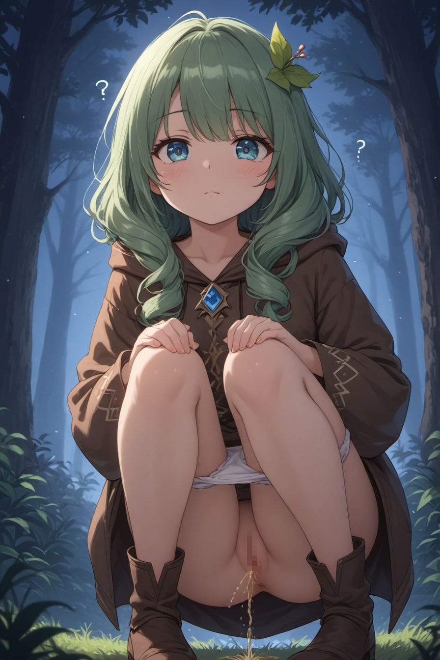 隠れて様子を見ていると…メイジちゃんは下着をおろし、その場で気持ちよさそうに用を足し始めた!!