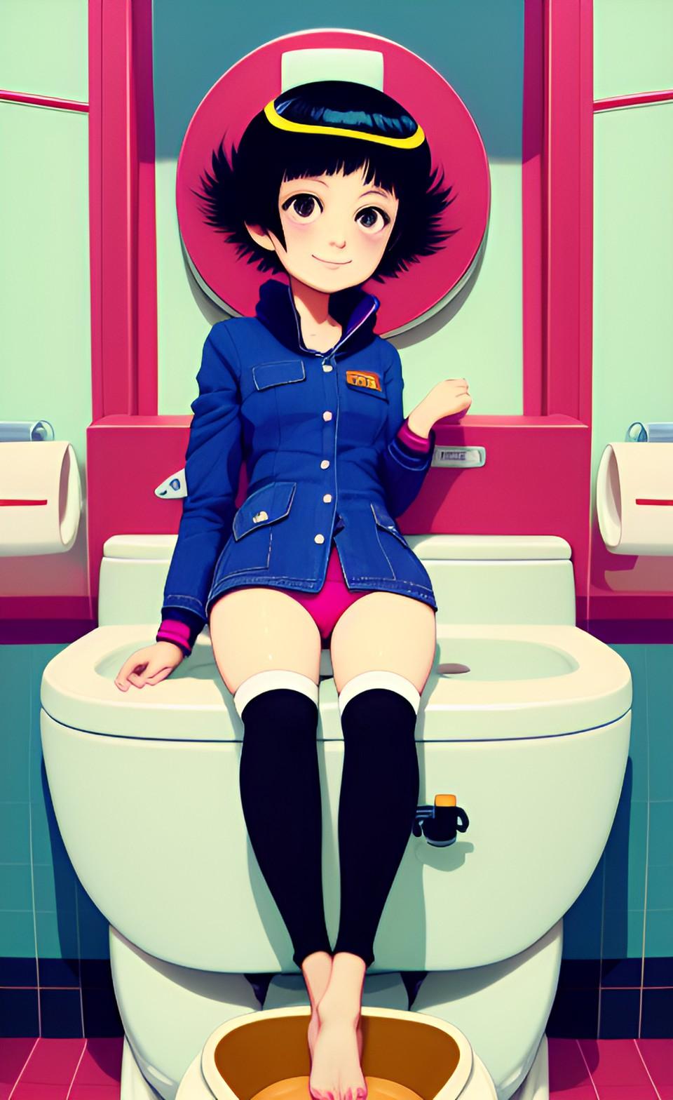「そこのお客さん、新型トイレはいかがですか?座るだけでなんにもせずにトイレを済ますことができますよ!大きい?お客さまのおケツに合わせて自動でサイズも変わります♪」(ヌードピンナップの14)