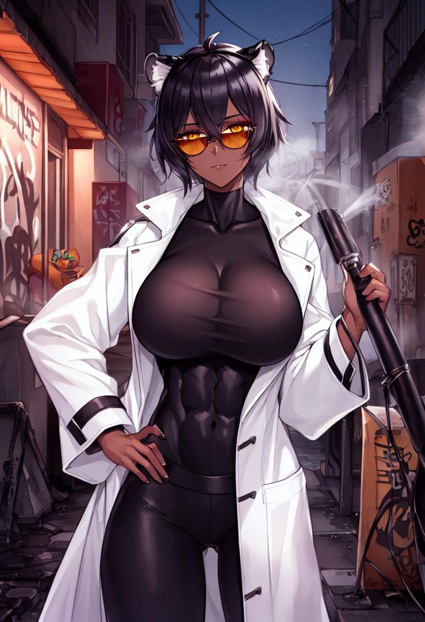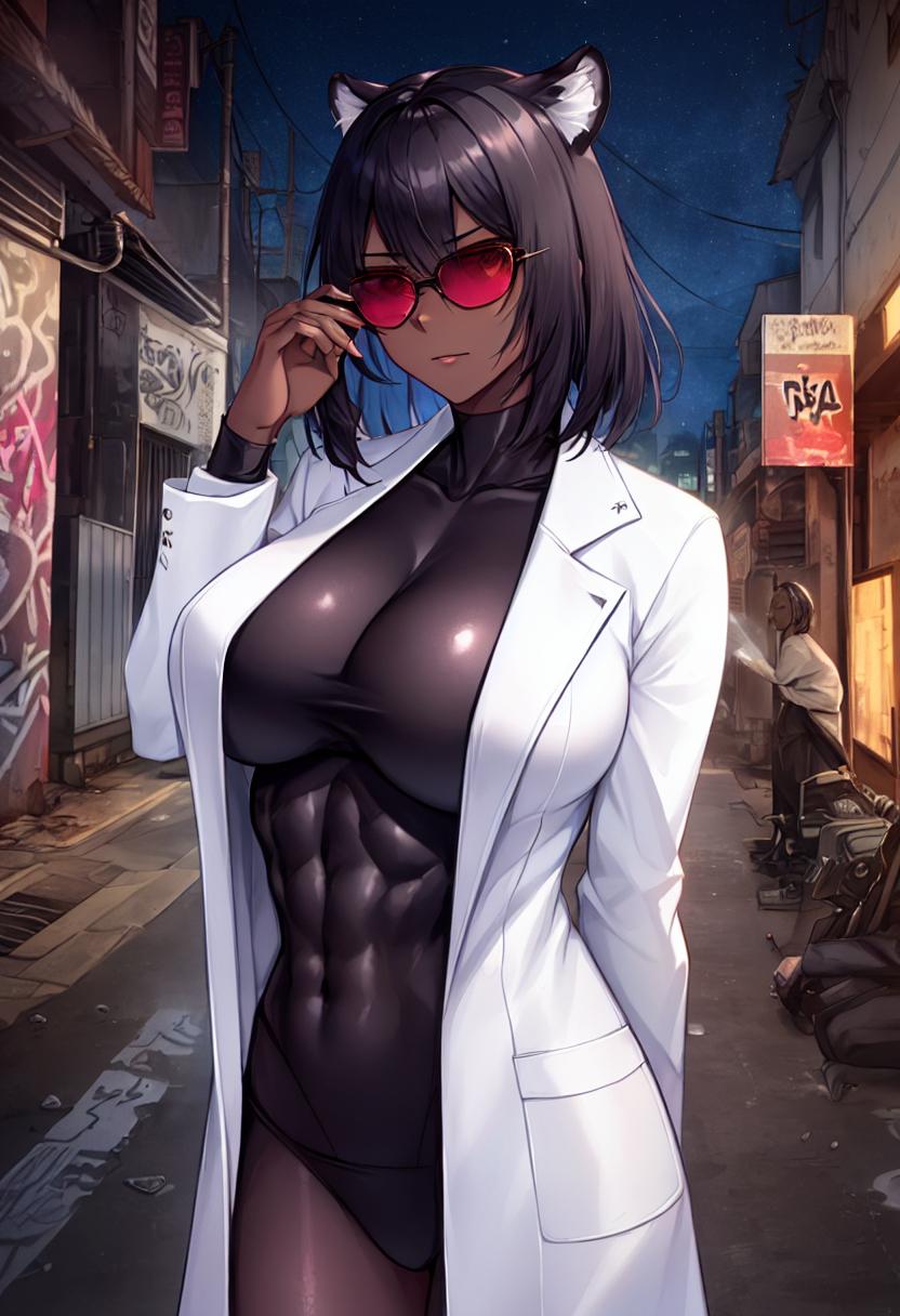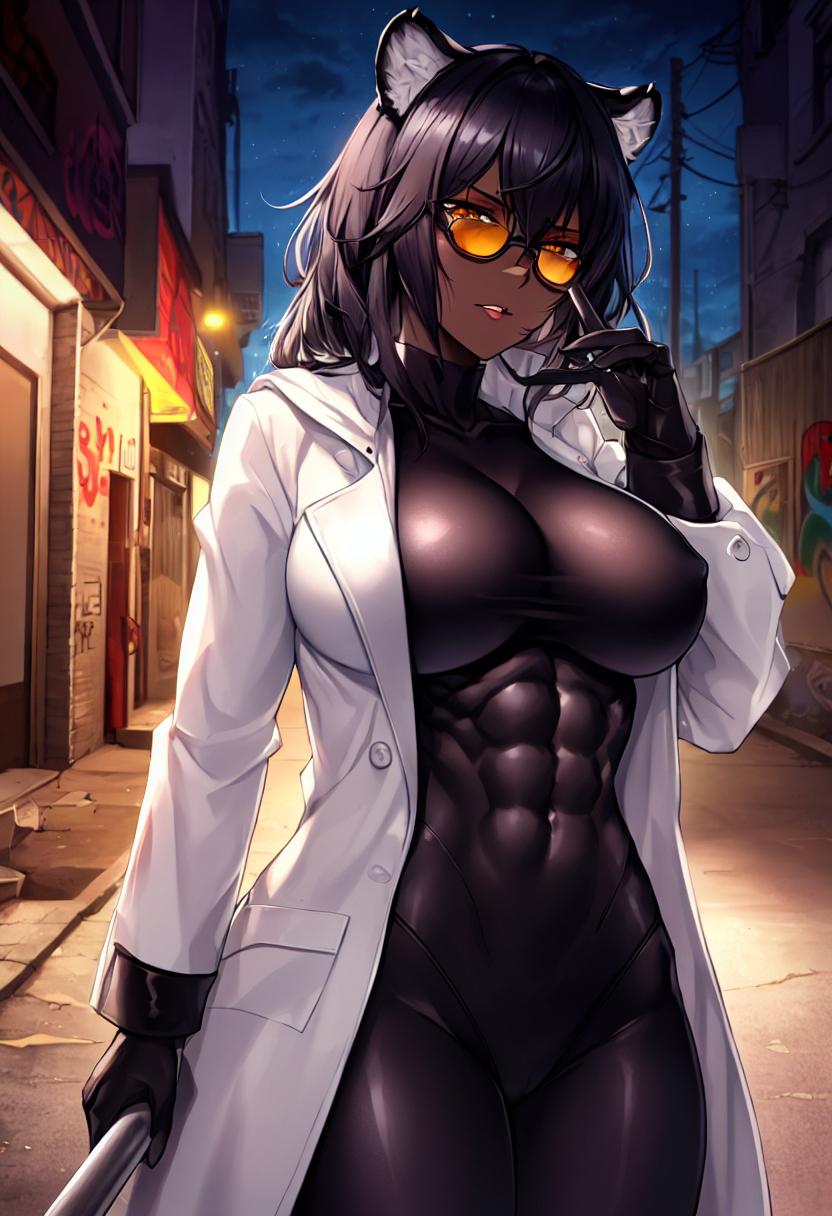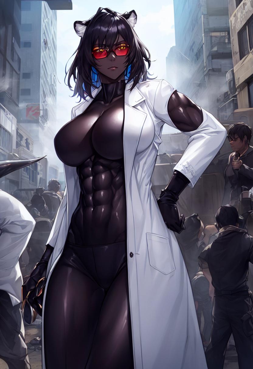 体にピッタリと張り付くような黒いボディスーツは、その下にある発達した野性的な筋肉美を浮き彫りにしている。その様は、まるで黒い豹だ。彼女を外見上から研究者たらしめているのは、その上に羽織る白衣のみだろう。