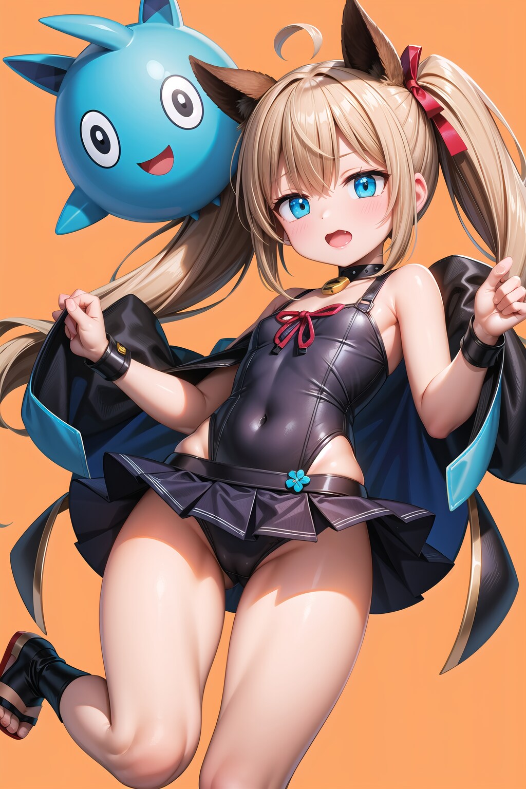 2 ケモ耳、金髪?ツインテール、つるべたボディスーツにマイクロミニスカートと謎キャラ
