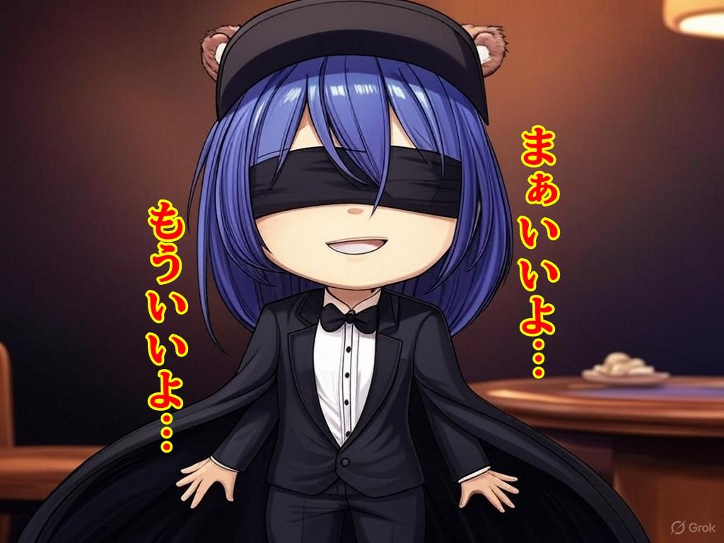 1girl,24yo,black cap,otter ears,medium hair,purpleblue hair,blindfold,tuxedo,flat chest,cloak,