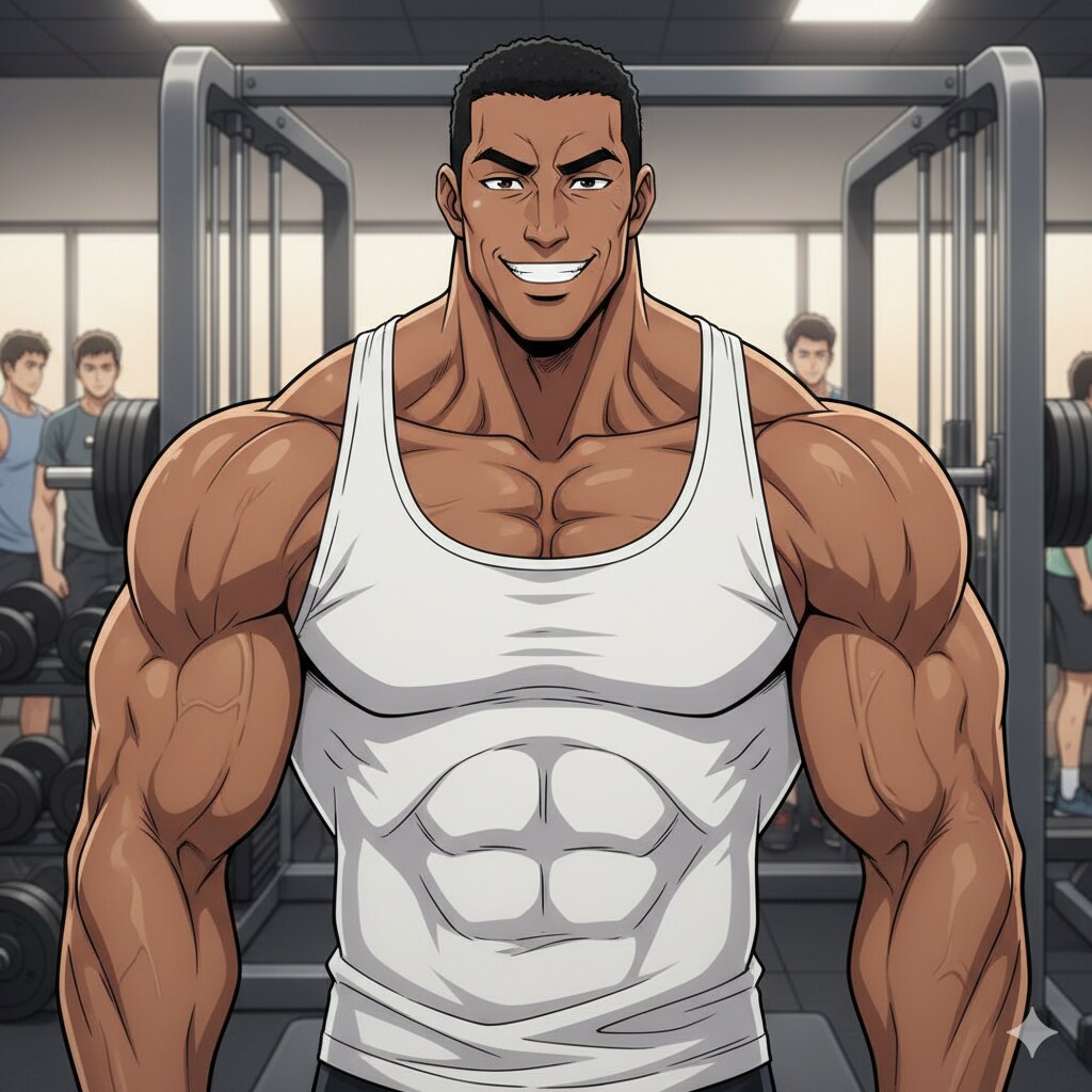 男性、一人、一人の男性、黒髪、短髪、短髪黒髪、褐色肌の男性、男前の男性、逞しい女男性、日焼けした褐色肌の男性、筋肉、筋肉質、逞しい筋肉質の男性、タンクトップ、タンクトップのシャツ、瞳、黒色の凛々しい瞳、高身長、高身長の男性、逞しい筋肉と褐色肌の男性、大きな身体と大胸筋の逞しい褐色肌の男性、大きな身体の逞しい褐色肌の男性、笑顔、明るい笑顔、白い歯、白い歯を見せる明るい笑顔の男性、詳細に、精確に、座っている、ソファー、ソファーに座っている体勢で、アニメイラストで作って