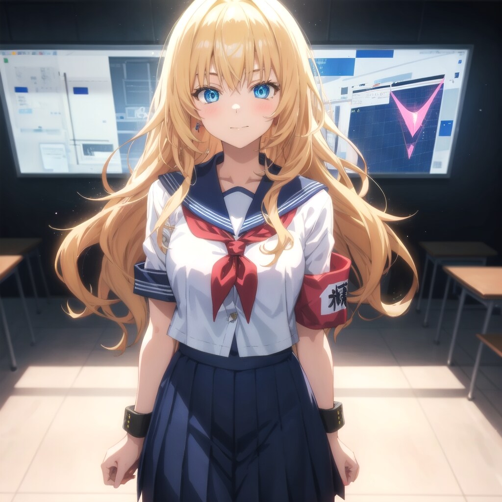 ちちぷいちゃんがGPU学園の生徒会に転校初日で挨拶しているシーン。緊張した表情で、生徒会の腕章をつけながらハイテク教室に立つ彼女。