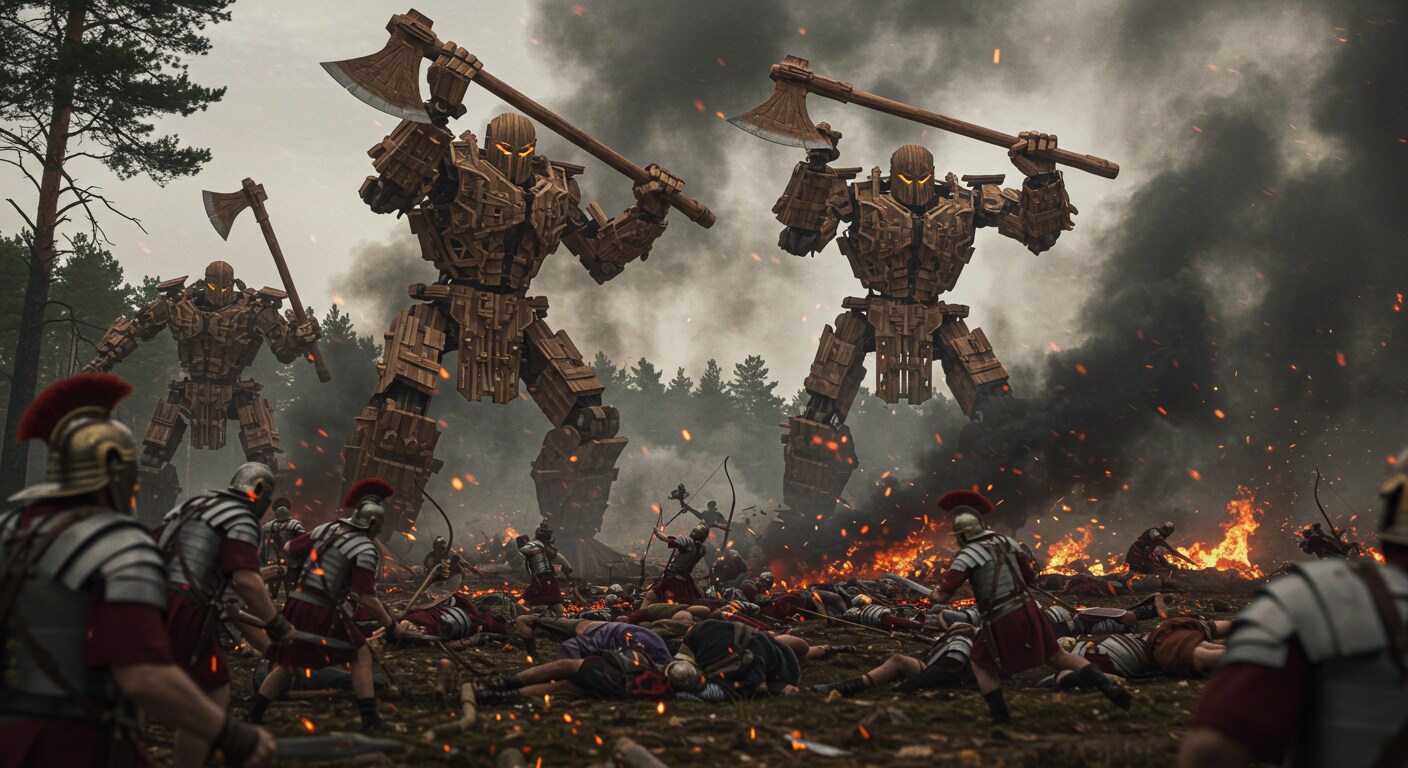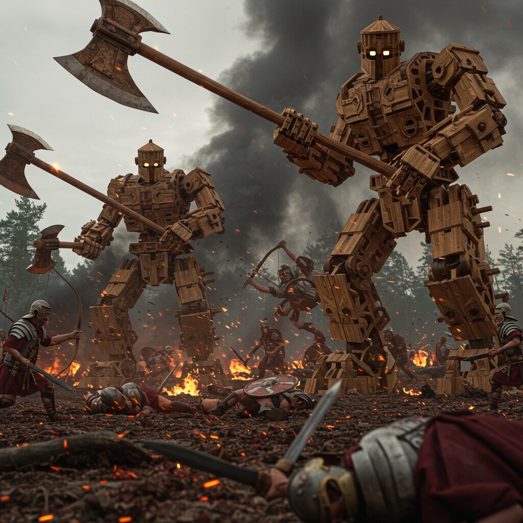 そもそも等身大なのがダメだったのかもしれないと思って巨大化してみたところ、急にしっくりきました。さらにローマ兵を配置して戦わせてみると、一気にスケール感と迫力が増しました。戦場のカオス感が足りなかったと気づきました。