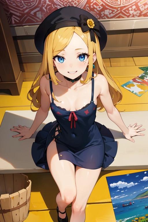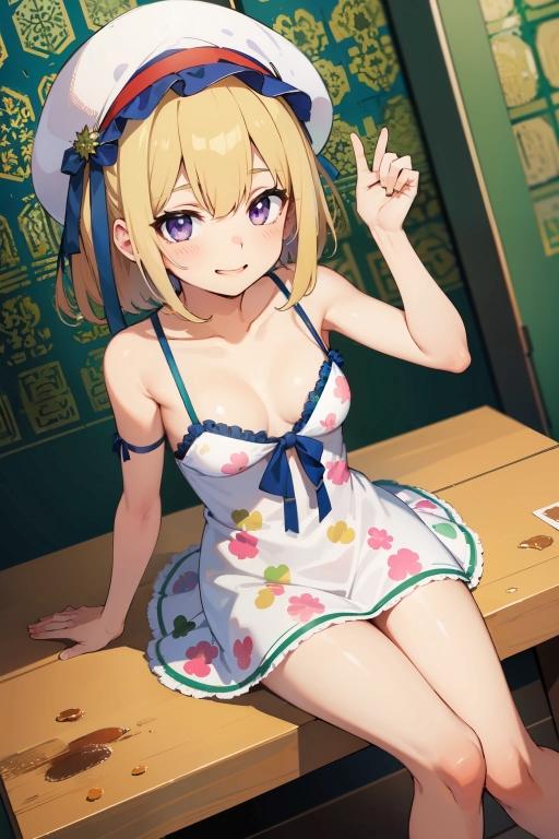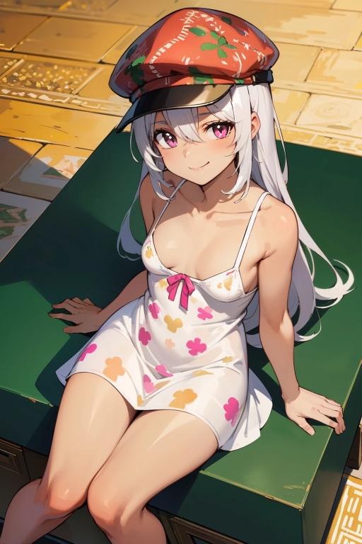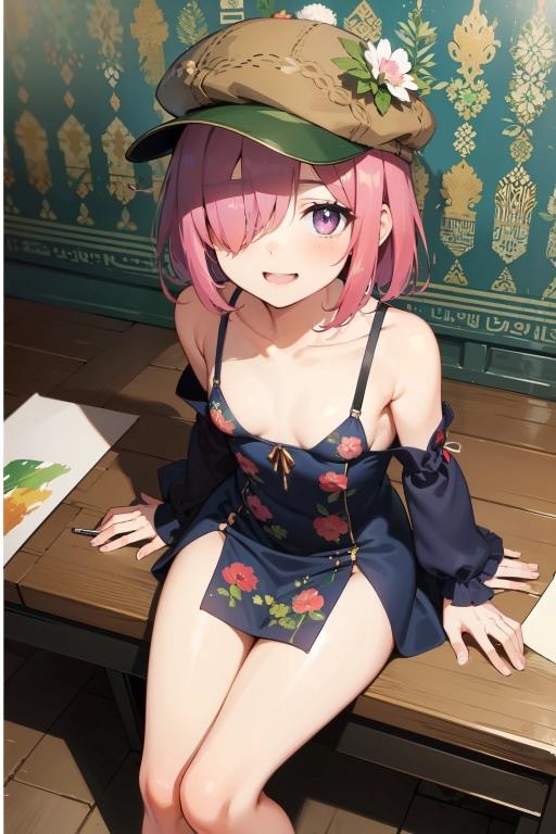服や帽子は花柄が出てくるが、背景では抽象的な装飾柄や