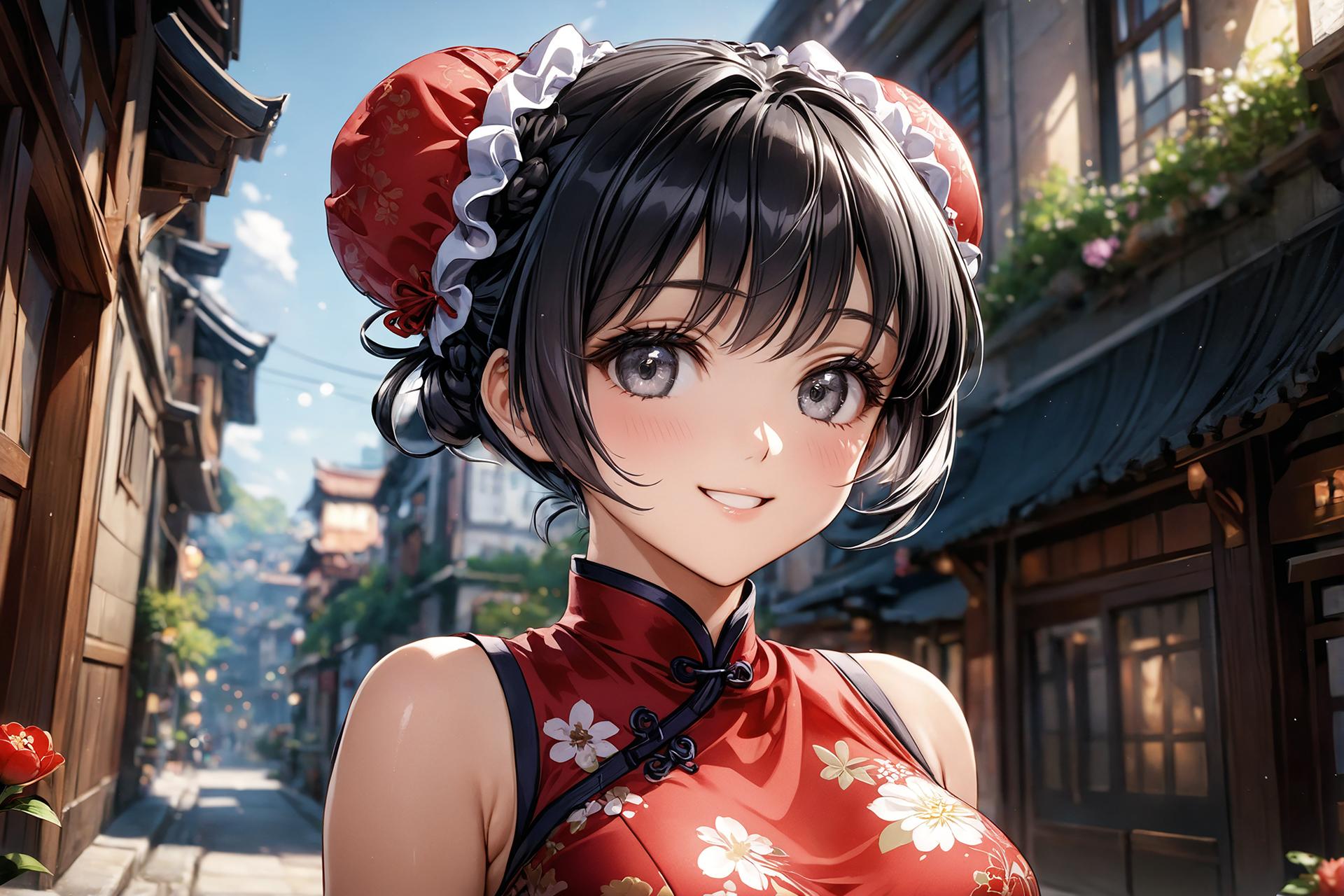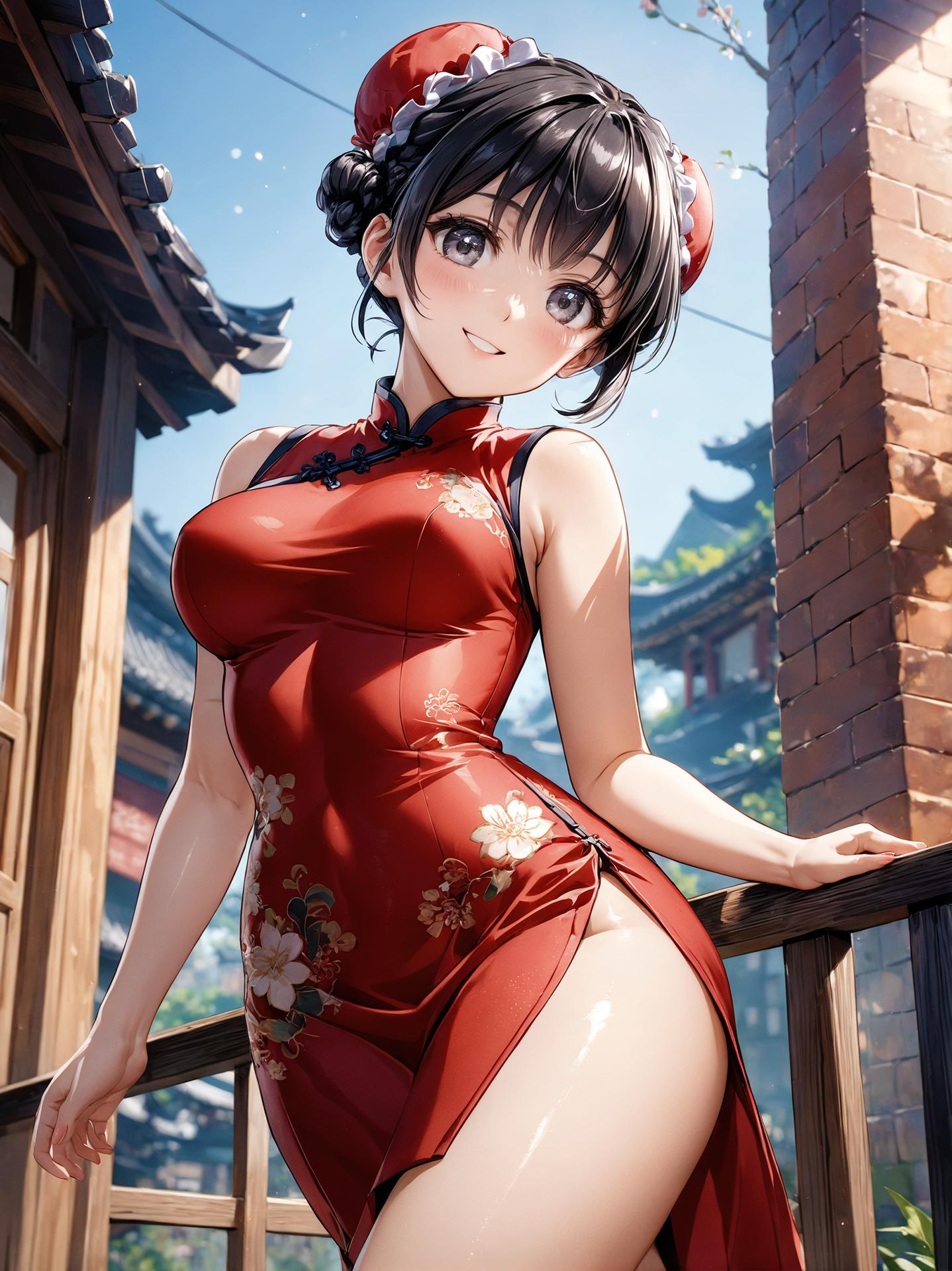 twin-bun cover, Chignon-Cover, wearing floral printed red cheongsam-dress,
